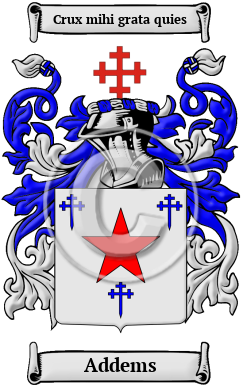 | Addems History, Family Crest & Coats of Arms Etymology of AddemsWhat does the name Addems mean? The surname Addems is derived from the name of an ancestor, as in 'the son of Adam.' This popular font-name in the 13th century claims the root 'Adam,' the given name in Genesis 1-5 for the first human. He features in various belief systems including Judaism, Christianity, Gnosticism and Islam. Early Origins of the Addems familyThe surname Addems was first found in Norfolk where it is thought that the first record of the name was Richard Adamessone who was listed there in the 13th century. 1 The name is "rare in the eastern and northern counties [of England]. In the north, however, its place is sometimes taken by Adamson and Addison, as in the county of Durham. It is at present best represented in Buckinghamshire, Devon, Hampshire, and Staffordshire, and in the counties on the Welsh border, Shropshire and Monmouthshire. This name, according to Lower, was more frequent in the Middle Ages. Adamson is found in the north of England and in the south of Scotland." 2 3 In Scotland, the name is fairly common in the present day Angus (now in Aberdeenshire, Dundee City and Perth and Kinross areas.) One of the first records of the family was Adam filius Ade filius Philippi who was burgess of Suhtberewick in 1261. Later, we found John Adamsone of the county of Berewyke took the oath of fealty in 1296 and Colin, son of Ade, was Provost of Aberdeen in 1340 and appears again in 1349 as Colin Adamson. John Adamson (fitz de Adam), a Scot, had a safe conduct to go to Bruges from England in 1433. Cuthbert Adamson was a notary public of Glasgow diocese, 1587. 4 Another source notes "the surname of Adam is of great antiquity in Scotland. Duncan Adam, son of Alexander Adam, lived in the reign of King Robert Bruce, and had four sons, from whom all the Adams, Adamsons, and Adies in Scotland are descended." 5 Early History of the Addems familyThis web page shows only a small excerpt of our Addems research. Another 89 words (6 lines of text) covering the years 1261, 1296, 1433, 1537, 1587, 1592, 1600, 1610, 1611, 1639, 1653, 1680, 1787, 1855 and 1890 are included under the topic Early Addems History in all our PDF Extended History products and printed products wherever possible. Addems Spelling VariationsAlthough the name, Addems, appeared in many references, from time to time, the surname was shown with the spellings Adamsone, Addamson, Adamson and others. Early Notables of the Addems familyHenry Adamson (d. 1639), a Scottish poetical writer, a native of Perth, was the son of James Adamson, who had been dean of guild in 1600, and provost in 1610 and 1611. 6