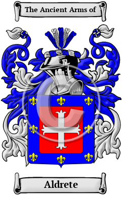 | Aldrete History, Family Crest & Coats of Arms Etymology of AldreteWhat does the name Aldrete mean? The surname Aldrete is derived from the Spanish words "aldea", meaning "village", and "aldeorrio", meaning "little place, rural backwater." Another source claims the name is from Arabic "al-daya" meaning "owner of a small farm." 1 Early Origins of the Aldrete familyThe surname Aldrete was first found in the capital city of Oviedo in Asturias in northern Spain. The name "originated with Count don Alderedo of the Conquest of Leon in 719. Alderetes founded homes in Galicia, Tordesillas, Toro, Valladolid, Salamanca, Olmedo, Toledo, Madrid, Aragon, and Andalucia." 1 Later, we found Don Martin de Alderete who died at the Battle of Najera in 1367. He is the ancestor of the noble Alderete family of Tordesillas and Olmedo in Valladolid, Castile and Leon. Early History of the Aldrete familyThis web page shows only a small excerpt of our Aldrete research. Another 80 words (6 lines of text) covering the years 1503, 1518, 1534, 1542, 1556, 1557, 1565, 1572, 1606, 1614, 1633, 1636, 1641 and 1653 are included under the topic Early Aldrete History in all our PDF Extended History products and printed products wherever possible. Aldrete Spelling VariationsUntil the dictionary, an invention of only the last few hundred years, the English language lacked any comprehensive system of spelling rules. Consequently, spelling variations in names are frequently found in early Anglo-Saxon and later Anglo-Norman documents. One person's name was often spelled several different ways over a lifetime. The recorded variations of Aldrete include Alderete, Aldrete, Alderetes, Aldaret, Aldarete and many more. Early Notables of the Aldrete familywere the Alderete family who were the Lords of Tordesillas in the 16th century, and one of their number Dom Pedro de Alderete constructed the famous Capilla de los Alderete (Chapel of the Alderete) in Tordesillas (photo attached). Don Pedro and Don Rodriguez Alderete are buried there in ornate tombs. The Palacio de los Alderete (The Alderete Palace) also still stands in Tordesillas. Many of the younger sons of the family went to Central and South America (as well as the Philippines) as conquistadors in the 16th and 17th Centuries.
