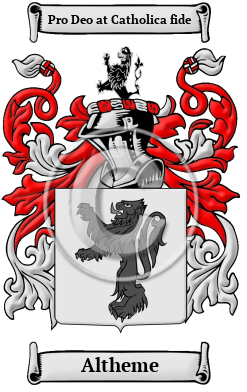 England Early Origins of the Altheme familyThe surname Altheme was first found in Lancashire where one of the first record of the name was found in 1246 when Adam de Eluetham held estates in what is now known as Altham in Whalley in that shire. Eltham in Kent was an ancient family seat. "This place, in Domesday Book called Alteham, is supposed to have derived its name from the Saxon, Eald, old, and Ham, a dwelling. It formed part of the royal demesnes in the reign of Edward the Elder, by whom it was given to Odo, Archbishop of Canterbury; and at a very early period became a favourite retreat of the English kings." 1 A few years later, John of Eltham, 1st Earl of Cornwall (1316-1336) born at Eltham Palace, Kent, was the second son of king Edward II of England and his queen Isabella of France, heir to the English throne. "Edward II. resided here for some time, and at this place also his son was born, from this circumstance called John of Eltham, and the palace, erroneously, King John's Palace." 1 He was buried with full honors at Westminster Abbey in January 1337. Early History of the Altheme familyThis web page shows only a small excerpt of our Altheme research. Another 78 words (6 lines of text) covering the years 1455, 1487, 1498, 1530, 1557, 1570, 1607, 1612, 1617, 1661 and 1786 are included under the topic Early Altheme History in all our PDF Extended History products and printed products wherever possible. Altheme Spelling VariationsAltheme has been spelled many different ways. Before English spelling became standardized over the last few hundred years, spelling variations in names were a common occurrence. As the English language changed in the Middle Ages, absorbing pieces of Latin and French, as well as other languages, the spelling of people's names also changed considerably, even over a single lifetime. Spelling variants included: Altham, Aletham, Althem, Althum, Allthem, Alltham, Eltham and many more. Early Notables of the Altheme familyAgnes of Eltham (1498-1530), an English noblewoman who was an orphan and ward of Dartford Priory in Dartford, Kent who married Adam Langstroth, the head of a landed family in Yorkshire with 'a considerable dowry'.
