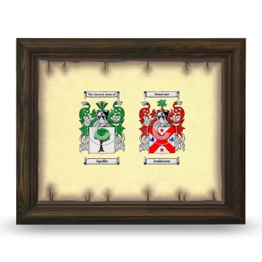 A classic solid wood brown frame with two Coats of Arms most commonly associated with your family's surname. Includes family crest and motto where available!