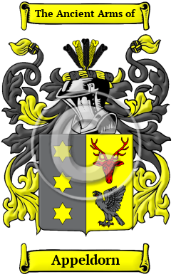 The surname Appeldorn was first found in Holland, where the name became noted for its many branches in the region, each house acquiring a status and influence which was envied by the princes of the region. The name was first recorded in Gelderland, (Guelders) an ancient province surrounding the town of Gelder. To the south of Friesland this province was originally in two parts north and south of the Rhine. In addition, the province is sub-divided into four towns, or quarters, Nijmegan, Arnhem, Zutphen and Roermond, each having unique rights and customs. Apeldoorn is a city of note. In their later history the surname became a power unto themselves and were elevated to the ranks of nobility as they grew into this most influential family.