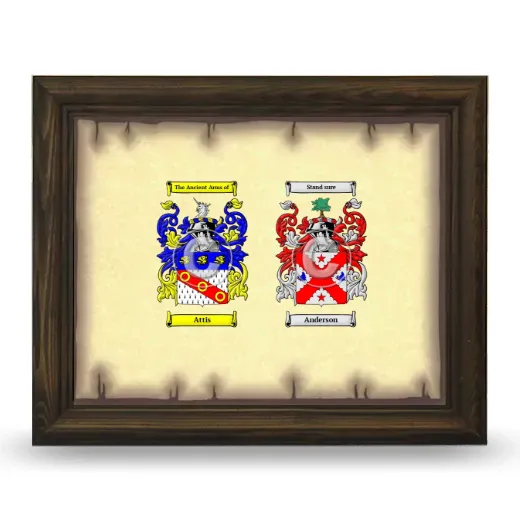 A classic solid wood brown frame with two Coats of Arms most commonly associated with your family's surname. Includes family crest and motto where available!