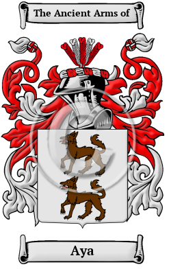Noble surnames, such as Aya, evoke images of the ancient homeland of the Spanish people. The original bearer of the name Aya, which is a local surname, once lived, held land, or was born in the beautiful region of Spain. In Spain, hereditary surnames were adopted according to fairly general rules and during the late Middle Ages, names that were derived from localities became increasingly widespread. Local names originally denoted the proprietorship of the village or estate. Many Spanish local names reflect Arabic words or place-names because Spain was conquered by the Muslim Moors from the 8th to 12th centuries. The Aya family originally derived its name from the name of the province of Ayala in Vascongadas.