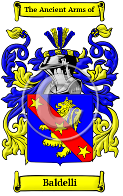 | Baldelli History, Family Crest & Coats of Arms Etymology of BaldelliWhat does the name Baldelli mean? The distinguished surname Baldelli can be traced back to the ancient and beautiful region of Lombardy. Although people were originally known only by a single name, it became necessary for people to adopt a second name to identify themselves as populations grew and travel became more frequent. The process of adopting fixed hereditary surnames was not complete until the modern era, but the use of hereditary family names in Italy began in the 10th and 11th centuries. Italian hereditary surnames were developed according to fairly general principles and they were characterized by a profusion of derivatives coined from given names. The most common type of family name found in the region of Lombardy is the patronymic surname, which is derived from the father's given name. During the Middle Ages, Italians adopted the patronymic system of name-making because it perfectly complemented the prevailing Feudal System. In Italy the popularity of patronymic type of surname is also due to the fact that during the Christian era, people often named their children after saints and biblical figures. The surname Baldelli came from the Germanic word baltha, which means gallant, bold. Early Origins of the Baldelli familyThe surname Baldelli was first found in the city of Cremona, which lies just south of Milan. The earliest records of the family lie here with the Baldesio family in the 8th century. Early History of the Baldelli familyThis web page shows only a small excerpt of our Baldelli research. The years 1160, 1281, 1296, 1298, 1343, 1507, 1550, 1553, 1579, 1585, 1624, 1650, 1683, 1695 and 1703 are included under the topic Early Baldelli History in all our PDF Extended History products and printed products wherever possible. Baldelli Spelling VariationsThere are many variations of most of those Italian names that originated in the medieval era. Some of these come from regional differences, like the tradition of ending northern names in "o" and southern names in "i". Others come from inaccuracies in the recording process, which were extremely common in the eras before dictionaries standardized spelling. Some of the spelling variations of Baldelli are Baldo, Baldi, Baudi, Baudo, Bauda, De Baudi, Debaudi, Baldelli, Baldella, Baldetti, Balde, Baldini, Baldin, Baldinotti, Balducci, Baldocci, Baldoni, Baldizzone, Baldacchi, Baldaco, Baldacchino, Baldecchi, Baldacci, Baldassi, Baldasso, Baldas, Baldassini, Baldasseroni, Baldassarini, Baldana, BaldaChina, Baldassin, Baldazzi, Baldani, Baldan, Baldaro, Baldari, Baldesi, Baldrati, Baldironi, Baudino, Baudinelli, Bauduccio, Baudone, Baudizzone, Baudacci, Baudassi, Baudasso and many more. Early Notables of the Baldelli familyRinaldo Baldacchini in Cortona in 1160, who owned much land and many castles; his son Filippo d' Antonio Baldacchini was a count in a Papal castle; Cino Baldi of Novara was a famous religious man in 1296 and Lapo Baldi took his position and status in 1298; Percivalle Baldissone was ambassador to Pope Martino IV in 1281 in Genoa. A soldier of the Baldelli lineage at this time was Pace Baldassino, who lived in Gubbio in 950. Also from this family in Gubbio was Baldoino Baldassini who was a count, San Ubaldo Baldassini was bishop of Bubbio, and a branch of... Another 180 words (13 lines of text) are included under the topic Early Baldelli Notables in all our PDF Extended History products and printed products wherever possible.