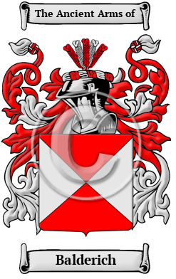 The surname Balderich was first found in Baden, where the name was anciently associated with the tribal conflicts of the area. They declared allegiances to many nobles and princes of early history, lending their influence in struggles for power and status within the region. They branched into many houses, and their contributions were sought by many leaders in their search for power.
