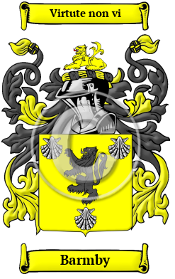 England Etymology of BarmbyWhat does the name Barmby mean? The Anglo-Saxon name Barmby comes from when the family resided in Barnby Hall, in the North Riding of Yorkshire. The name of that place is derived from the Old English personal name Beornwald, which comes from the words beorn, meaning young warrior, and wald, meaning rule. 1 Today, Barnby is also a village and civil parish in the Waveney district of Suffolk. Early Origins of the Barmby familyThe surname Barmby was first found in Yorkshire, where the earliest record is at Barnby Hall, in the parish of Calthorne, in the east riding of Yorkshire. 2 "The township anciently belonged to a family of the same name; mention occurring of Robert de Barneby, who held the lands under Peter de Mauley, lord of Mulgrave." 3 The Hundredorum Rolls of 1273 lists: Richard de Barneby in Yorkshire; and Henry de Barneby in Lincolnshire. Later the Yorkshire Poll Tax Rolls of 1379 listed: Thomas de Barmby; and Thomas de Barnby. 4 Barnby in the North Riding of Yorkshire was an ancient family seat. "The township anciently belonged to a family of the same name; mention occurring of Robert de Barneby, who held the lands under Peter de Mauley, lord of Mulgrave." 3 Early History of the Barmby familyThis web page shows only a small excerpt of our Barmby research. Another 64 words (5 lines of text) covering the years 1000, 1550, 1838 and 1875 are included under the topic Early Barmby History in all our PDF Extended History products and printed products wherever possible. Barmby Spelling VariationsBefore English spelling was standardized a few hundred years ago, spelling variations of names were a common occurrence. Elements of Latin, French and other languages became incorporated into English through the Middle Ages, and name spellings changed even among the literate. The variations of the surname Barmby include Barneby, Barnby, Barnaby, Bernaby, Burnaby and many more. Early Notables of the Barmby familyJoseph Barnby, born at York Aug. 12, 1838, a chorister in York Minster, and student at the Royal Academy of Music: was for nine years organist of St. Andrew's, Wells Street, London, and contributed much to the excellence of the services at that... Another 43 words (3 lines of text) are included under the topic Early Barmby Notables in all our PDF Extended History products and printed products wherever possible. Migration of the Barmby familyA great wave of immigration to the New World was the result of the enormous political and religious disarray that struck England at that time. Families left for the New World in extremely large numbers. The long journey was the end of many immigrants and many more arrived sick and starving. Still, those who made it were rewarded with an opportunity far greater than they had known at home in England. These emigrant families went on to make significant contributions to these emerging colonies in which they settled. Some of the first North American settlers carried this name or one of its variants: John Barnabie who settled in Virginia in 1620; James Barnaby who settled in Virginia in 1640; Sarah Barnaby who settled in Virginia in 1640.