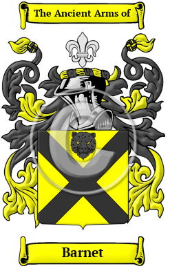 | Barnet History, Family Crest & Coats of Arms Etymology of BarnetWhat does the name Barnet mean? The ancestors of the name Barnet date back to the Anglo-Saxon tribes of Britain. The name is derived from when the Barnet family lived on or near land cleared for cultivation by burning off the forest. The name may also have been patronymic as in "'the son of Bernard,' or 'Barnard.' The Cistercian monk gave a wonderful impetus in the 13th century to this name, already popular. A large number of Bernards sprang up in Furness after the Abbey came under the Bernardino rule." 1 Early Origins of the Barnet familyThe surname Barnet was first found in Herefordshire at Chipping Barnet, a parish, town, and the head of a union, in the hundred of Cashio. "This place, called also High Barnet, from its situation on the summit of a hill, derives its distinguishing name from the privilege granted to the monks of St. Alban's, of holding a market here. On April 5th, 1471, the decisive battle which terminated in the defeat and death of the Earl of Warwick, and established Edward IV. on the throne, took place on Gladmore Heath, a mile north-west of the town." 2 Barnet by the Wold is a parish, in the union of Glandford-Brigg, S. division of the wapentake of Yarborough, parts of Lindsey, Lincolnshire, East Barnet is a parish, in the union of Barnet, hundred of Cashio, Herefordshire and Fryern Barnet is a parish, in the union of Barnet, Finsbury division of the hundred of Ossulstone, county of Middlesex. "It is supposed that an abbey anciently existed here from which the place obtained the prefix to its name, and that the old manor-house, now taken down, was the summer residence of the abbots. " 2 The singular name Bernadus was listed in the Domesday Book of 1086 in Huntingdonshire. 3 A few years later, it appeared again in Norfolk (1101-1116.) 4 With a forename, one the earliest records was that of John Barnet (d. 1373), an English bishop successively of Worcester, Bath and Wells, and Ely, and was chaplain to Thomas Lisle. 5 Early History of the Barnet familyThis web page shows only a small excerpt of our Barnet research. Another 63 words (4 lines of text) covering the years 1400, 1760, 1799, 1806, 1807, 1816, 1820, 1836 and 1890 are included under the topic Early Barnet History in all our PDF Extended History products and printed products wherever possible. Barnet Spelling VariationsIt is only in the last few hundred years that the English language has been standardized. For that reason, early Anglo-Saxon surnames like Barnet are characterized by many spelling variations. As the English language changed and incorporated elements of other European languages, even literate people changed the spelling of their names. The variations of the name Barnet include: Barnett, Barnette, Barnet and others. Early Notables of the Barnet family- James Barnett (c. 1760-1836), an English banker and Whig politician who sat in the House of Commons and a Member of Parliament for Rochester (1806-1807) and (1816-1820.)