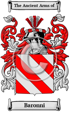 | Baronni History, Family Crest & Coats of Arms Etymology of BaronniWhat does the name Baronni mean? From the historical and enchanting Italian region of Tuscany emerged a multitude of noble families, including the distinguished Baronni family. During the Middle Ages, as populations grew and travel between regions became more frequent, the people of Tuscany found it necessary to adopt a second name to identify themselves and their families. The process of adopting fixed hereditary surnames was not complete until the modern era, but the use of hereditary family names in Italy began in the 10th and 11th centuries. Italian hereditary surnames were developed according to fairly general principles and they were characterized by a profusion of derivatives coined from given names. Although the most common type of family name found in Tuscany is the patronymic surname, which is derived from the father's given name, the nickname type of surname is also frequently found. Nickname surnames were derived from an eke-name, or added name. They usually reflected the physical characteristics or attributes of the first person that used the name. The surname Baronni is a name for a courageous or brave person having derived from the Latin word "barus." Early Origins of the Baronni familyThe surname Baronni was first found in the town of Baroncello, just outside the historic city of Florence. Earliest records tell of the family Baroncelli, who owned a castle in Baroncello, and moved to Florence in the 11th century. In those ancient times only persons of rank, the podesta, clergy, city officials, army officers, artists, landowners were entered into the records. To be recorded at this time, at the beginning of recorded history, was of itself a great distinction and indicative of noble ancestry. Early History of the Baronni familyThis web page shows only a small excerpt of our Baronni research. Another 104 words (7 lines of text) covering the years 1260, 1287 and 1532 are included under the topic Early Baronni History in all our PDF Extended History products and printed products wherever possible. Baronni Spelling VariationsSurnames that originated in Italy are characterized by an enormous number of spelling variations. Some of these are derived from regional traditions and dialects. Northern names, for instance, often end in "o", while southern names tend to end in "i". Other variations come from the fact the medieval scribes tended to spell according to the sound of words, rather than any particular set of rules. The recorded variations of Baronni include Barone, Baronio, Varone, Varoni, Varuni, Varone, Baroncelli, Baronchelli, Baroncini, Barelli, Barello, Barel, Barella, Barellini, Barettin, Baruzzi, Baret, Barettini, Barucci, Baruzzo, Barusso, Barocci, Baronti, Barontini, Baroni and many more. Early Notables of the Baronni familyBuonricovero di Folco di Bene Baroncelli, who was a priest in Florence in 1287; Deodato Baronci, one of 16 priests of the Baronci family in Florence in the 13th and 14th centuries; as well as Galeotto Baronci, an important member of the community in the 14th century. Gabriello Barone of Lecce was a great soldier who conquered the provinces of Bari and Lecce for the Venetian people. With his army of 800, he then took Ostuni, Brindisi, Mesagne, and Lecce. His brother Raffaele Barone was a general... Another 87 words (6 lines of text) are included under the topic Early Baronni Notables in all our PDF Extended History products and printed products wherever possible. Migration of the Baronni familyIn the immigration and passenger lists were a number of people bearing the name Baronni Jonas Barone, who arrived in Philadelphia, Pennsylvania, in 1766; Gaetano Barone, who arrived in New York city in 1893 aboard the EMS, as well as Raffaele Barone, who was naturalized in West Virginia in 1898..