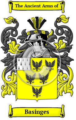 England Early Origins and Etymology of BasingesThe surname Basinges was first found in Hampshire at Basing or Old Basing as it is sometimes known. This village and parish is in the union and hundred of Basingstoke. The first listing of this Saxon place name was found in 871 when it was listed as Basengum. An Anglo-Saxon tribe was known as the Basingas and some believe that is the true source of the village name as literally the place name means "settlement of the followers of a man called Basa." 1 "This place is remarkable for having been the scene of the defeat of King Ethelred I by the Danes, in 871." 2 The Battle of Basing was on the 22nd of January in 871. " At the period of the Norman survey, Hugh de Port held fifty-five lordships in the county, of which Basing was the head" 2 Hence, conjecturally, the surname is descended from the tenant of the lands who was recorded in the Domesday Book. Salomon de Basing was Lord Mayor of London in 1217 and years later, Adam de Basing was similarly Lord Mayor of London in 1251. John Basing or Basingstoke (d. 1252), Archdeacon of Leicester, takes his name from the town of Basingstoke in Hampshire. "He seems to have been one of the earliest Englishmen who possessed a real knowledge of Greek, and was probably one of the first natives of our islands - if we except the doubtful instance of Johannes Scotus Erigena - who perfected himself in this language by a sojourn at Athens. " 3 Early History of the Basinges familyThis web page shows only a small excerpt of our Basinges research. Another 143 words (10 lines of text) covering the years 1214, 1216, 1243, 1251, 1306, 1510, 1558 and 1600 are included under the topic Early Basinges History in all our PDF Extended History products and printed products wherever possible. Basinges Spelling VariationsAnglo-Norman names tend to be marked by an enormous number of spelling variations. This is largely due to the fact that Old and Middle English lacked any spelling rules when Norman French was introduced in the 11th century. The languages of the English courts at that time were French and Latin. These various languages mixed quite freely in the evolving social milieu. The final element of this mix is that medieval scribes spelled words according to their sounds rather than any definite rules, so a name was often spelled in as many different ways as the number of documents it appeared in. The name was spelled Basing, Basings, Bainges and others. Early Notables of the Basinges familySalomon de Basing (fl. 13th century), an English politician of medieval London who served alongside Hugh Basing as a Sheriff of London in 1214, and was elected Lord Mayor in 1216 after the deposition of Jacob Alderman on Trinity Sunday.