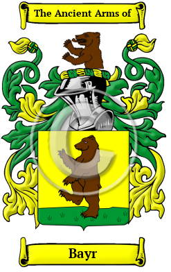 The surname Bayr was first found in Lower Austria and Tyrol, where the name contributed greatly to the development of an emerging nation, which would later play a large role in the tribal and national conflicts of the area. In later years the name branched into many houses, each playing a significant role in local social and political affairs. Literally, the name means "Bavarian," but all of the most prominent branches arose in either Austria or Wuerttemberg, and in particular regions bordering on Bavaria.