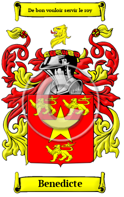 England Etymology of BenedicteWhat does the name Benedicte mean? The Anglo-Saxon name Benedicte comes from the personal name, Benedict, which was derived from the Latin name Benedictus, which meant blessed by God. 1 Another source notes the name could have been "from Benedictus, blessed, well spoken of, or a person wishing all good." 2 Early Origins of the Benedicte familyThe surname Benedicte was first found in Warwickshire, where they held a family seat from ancient times. Benedict Biscop (628?-690), also called Biscop Baducing, was "founder of monasteries at Wearmouth and Jarrow, was an Angle of noble birth (Beda, v. 19, and Vita Abbat. i.), possibly of the royal race of the Lindisfari." 3 Benedict of Gloucester (fl. 1120), was author of a life of St. Dubricius, Archbishop of Caerleon, was, according to his own description of himself, a monk of St. Peter's, Gloucester. Benedict (d. 1193), was "Abbot of Peterborough, whose birthplace is unknown, was probably a monk of Christ Church, Canterury, of which monastery he became prior in 1175. In 1177 he was elected to the abbacy of Peterborough, and died in that office at Michaelmas, 1193." 3 Early History of the Benedicte familyThis web page shows only a small excerpt of our Benedicte research. Another 232 words (17 lines of text) covering the years 1221, 1273, 1322, 1500, 1617, 1638, 1689 and 1871 are included under the topic Early Benedicte History in all our PDF Extended History products and printed products wherever possible. Benedicte Spelling VariationsOne relatively recent invention that did much to standardize English spelling was the printing press. However, before its invention even the most literate people recorded their names according to sound rather than spelling. The spelling variations under which the name Benedicte has appeared include Benedict, Benedicte, Benedici, Benedicti and many more. Early Notables of the Benedicte family- Geoffrey Benedicte, a prominent 13th century landholder in Warwickshire