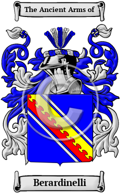 | Berardinelli History, Family Crest & Coats of Arms Etymology of BerardinelliWhat does the name Berardinelli mean? The Berardinelli family can trace its noble origins to the Italian region of Piedmont. Although people were originally known only by a single name, it became necessary for people to adapt a second name to identify themselves as populations grew and travel became more frequent. The process of adopting fixed hereditary surnames was not complete until the modern era, but the use of hereditary family names in Italy began in the 10th and 11th centuries. Italian hereditary surnames were developed according to fairly general principles and they are characterized by a profusion of derivatives coined from given names. Although the most traditional type of family name found in the region of Piedmont is the patronymic surname, which is derived from the father's given name, local surnames are also found. Local names, which are the least frequent of the major types of surnames found in Italy, are derived from a place-name where the original bearer once resided or held land. Often Italian local surnames bore the prefix "di," which signifies emigration from one place to another, but does not necessarily denote nobility. The Berardinelli family lived in the region of Piedmont. Early Origins of the Berardinelli familyThe surname Berardinelli was first found in the valleys of Maira, which lie south of Turin. The Berardi family can be traced back to this area, where they resided in the 12th century. Saint Berardo (died 1123) is an Italian saint, patron saint of the city and diocese of Teramo. Early History of the Berardinelli familyThis web page shows only a small excerpt of our Berardinelli research. The years 1320, 1387, 1442, 1445, 1495, 1497, 1555, 1640, 1690, 1695, 1719, 1850 and 1868 are included under the topic Early Berardinelli History in all our PDF Extended History products and printed products wherever possible. Berardinelli Spelling VariationsItalian surnames come in far more variations than the names of most other nationalities. Regional traditions and dialects are a decisive factor in this characteristic. For example, northern names tend to end in "o", while southern in "i". Also important, but not unique to Italy, was the fact that before dictionaries and the printing press most scribes simply spelled words according to their sounds. The predictable result was an enormous number of spelling variations. The recorded spellings of Berardinelli include Berardi, Berardo, Berardis, Beraldi, Beraldo, Beraudo, Verardi, Verardo, Veraldi, Veraldo, Veralli, Verallo, Velardi, Velardo, Vilardi, Vilardo, Berardelli, Berardini, Berardino, Berardinelli, Berardinetti, Berardocchi, Berarducci, Beraldini, Beraldin, Belardelli, Belardetti, Belardini, Belardinelli, Belardoni, Bellardino and many more. Early Notables of the Berardinelli familyGiovanni Berardi, an ecclesiastic in Tagliacozzo in the 13th century; Aldevrandino Beraldi was councillor of Treviso in the 14th century; Tommaso Beraldi was a judge and ambassador in Venice in 1320; Bartolomeo Beraldo was mayor of Castelfranco in 1387.