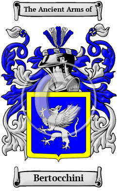 | Bertocchini History, Family Crest & Coats of Arms Early Origins of the Bertocchini familyThe surname Bertocchini was first found in the city of Ferrara, where Giacomo Bertazzi was assistant to Pope Sergio II in 845. Francesco Bertazzi, was head of the Venetian Republic in the year 1007; Enrico Bertoli in Mazzara, elected Cardinal by Pope Pasquale II in 1110; the Bertone family of Chieri owned vast lands and belonged to the most ancient and most prestigious nobility; Bellincione Berti, born in 1220 in Florence, was talked about twice by Dante in the Paradiso as being a noble citizen. Today it is difficult to imagine the movement of people throughout Europe. London was often the epicenter of culture. Francesca Bertolli "arrived in England about the end of September 1729 and was a splendid contralto, and 'also a very genteel actress, both in men and women's parts.' She was one of the new company with which Handel opened the season of 1729-1730, and appeared in 'Lotario' and the revival of 'Tolomeo,' and in 'Partenope,' Feb. 24, 1730." 1 Early History of the Bertocchini familyThis web page shows only a small excerpt of our Bertocchini research. The years 1450, 1544, 1574, 1600, 1602, 1640, 1643, 1690, 1696, 1721, 1725, 1727, 1750, 1756, 1766, 1772, 1776, 1777, 1798, 1810, 1814, 1820, 1821, 1830 and 1854 are included under the topic Early Bertocchini History in all our PDF Extended History products and printed products wherever possible. Bertocchini Spelling VariationsIn comparison with other European surnames, Italian surnames have a surprising number of forms. They reflect the regional variations and the many dialects of the Italian language, each with its own distinctive features. For example, in Northern Italy the typical Italian surname suffix is "i", whereas in Southern Italy it is "o". Additionally, spelling changes frequently occurred because medieval scribes and church officials often spelled names as they sounded rather than according to any specific spelling rules. The spelling variations in the name Bertocchini include Berti, Berto, Bert, Berta, De Berti, De Berto, Di Berto, Bertelli, Bertello, Bertella, Bertini, Bertino, Bertinetti, Bertinetto, Bertucci, Berteri, Bertieri, Bertera and many more. Early Notables of the Bertocchini familySimone di Bartolomeo Berti was a Florentine monk in 1450; Giacomo Bertacchi was mayor of Sassuolo in 1602; another Giacomo Bertacchini was mayor of Savignano in 1690; Jacopo Bertoia, also known as Giacomo Zanguidi or Jacopo Zanguidi or Bertoja, (1544-ca.1574), was an Italian painter; Alessandro Pompeo Berti was a philosopher, theologian, and monk in Lucca in 1690; Giorgio Pietro Berti was a composer, organ player, and singer in Venice in the 17th century; Mauro Berti was a famous painter and architect in Bologna in 1772; Gasparo Berti (c.1600-1643) was... Another 88 words (6 lines of text) are included under the topic Early Bertocchini Notables in all our PDF Extended History products and printed products wherever possible. Migration of the Bertocchini familyA look at the immigration and passenger lists has shown a number of people bearing the name Bertocchini: Bert Bertola, who arrived in New Orleans, Louisiana, in 1822 at the age of 34; and Charles Berto, who arrived in Philadelphia, Pennsylvania, in 1858, Silvio Berti, who was recorded in Pennsylvania in 1903, as well as Louis Bertino, who arrived in New York city in 1864..