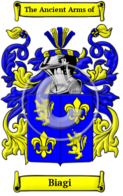| Biagi History, Family Crest & Coats of Arms Etymology of BiagiWhat does the name Biagi mean? The distinguished surname Biagi originated in an area of Italy, known as the Papal States. Although people were originally known only by a single name, it became necessary for people to adapt a second name to identify themselves as populations grew and travel became more frequent. The process of adopting fixed hereditary surnames was not complete until the modern era, but the use of hereditary family names in Italy began in the 10th and 11th centuries. Italian hereditary surnames were developed according to fairly general principles and they are characterized by a profusion of derivatives coined from given names. Although the most traditional type of family name found in the region of the Papal States is the patronymic surname, which is derived from the father's given name, local surnames are also found. Local names, which are the least frequent of the major types of surnames found in Italy, are derived from a place-name where the original bearer once resided or held land. Often Italian local surnames bore the prefix "di," which signifies emigration from one place to another, but does not necessarily denote nobility. The Biagi family lived in the city of Benevento, which lies east of Naples. Earliest records date back to the 14th century, when the Blasio family branched from this town to Bari, Catanzaro, and Reggio di Calabria. Early Origins of the Biagi familyThe surname Biagi was first found in the city of Benevento. Early History of the Biagi familyThis web page shows only a small excerpt of our Biagi research. The years 1530, 1688, 1740, 1750, 1755, 1764, 1792, 1819 and 1839 are included under the topic Early Biagi History in all our PDF Extended History products and printed products wherever possible. Biagi Spelling VariationsSurnames that originated in Italy are characterized by an enormous number of spelling variations. Some of these are derived from regional traditions and dialects. Northern names, for instance, often end in "o", while southern names tend to end in "i". Other variations come from the fact the medieval scribes tended to spell according to the sound of words, rather than any particular set of rules. The recorded variations of Biagi include Biaggi, Biagi, Biasi, Biasii, Biasio, Biase, Blasi, Blasio, Biagini, Biagia, Blase, Blas, De Biagi, De Biaggi, De Biasi, Debiasi, De Biase, De Blasi, De Blasio, De Blase, De Blasis, De Blasiis, De Biagio, Di Biasi, Di Biasio, Di Biaso, Di Biase, Di Blasi, Di Blas, Blasich, Blasic, Blasig, Blasigh, Blasevich, Biagelli, Biagetti, Beagini, Biagioli, Biagiotti, Biagioni, Biagianti, Biasetti, Biasetton, Biasini, Biasin, Biasioli, Biasiolo, Biasol, Biasotti, Biasiotti, Biasuz, Biasioni, Biasione, Biasone, Biason, Biasiutti, Biasiutto, Biasutti, Biasutto, Blasetti, Blasini, Blasina, Blasoni and many more. Early Notables of the Biagi family- Gregorio Biagio, who was a lawyer in Genoa in 1530