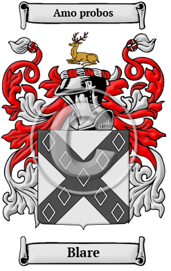 | Blare History, Family Crest & Coats of Arms Etymology of BlareWhat does the name Blare mean? The chronicles of the Blare family show that the name was first used in the Scottish/English Borderlands by the Strathclyde-Britons. It was a name for a person who lived in the village of Blair, in the county of Ayrshire. "The Blairs 'of that ilk' in Ayrshire, have been seated in that co. for more than 600 years. They claim the chief-ship of all the Blairs in the South and West of Scotland, though that honour is challenged by the Blairs of Balthayock, co. Perth, who date back to the beginning of the XIII. " 1 Early Origins of the Blare familyThe surname Blare was first found in Ayrshire (Gaelic: Siorrachd Inbhir Àir), formerly a county in the southwestern Strathclyde region of Scotland, that today makes up the Council Areas of South, East, and North Ayrshire. Some of the earliest recorded instances of this Clan name include Stephen de Blare, who was a recorded witness of a document about the monastery of Arbroath between 1204 and 1211, and of Brice de Blair and Alexander del Blair, who witnessed an agreement between the burgh of Irvine and Brice de Eglustone in 1205. Alexander de Blare witnessed a charter by Fergus, earl of Buchan before 1214, and also a charter by Randulf de Strethphetham. William of Blare who witnessed a charter by Malcolm, seventh earl of Fife, is probably Sir William de Blar, seneschal of Fife, 1235. David de Blare of Perthshire rendered homage in 1296 to King Edward I of England. 2 William of Blare witnessed a charter by Malcolm, 7th Earl of Fife. He is probably the same man as Sir William de Blar, who was Seneschal of Fife in 1235. His son, Sir Bryce Blair, was known as "the gallant knight." He fought with Sir William Wallace but was eventually taken prisoner, and executed at Ayr. 2 John Blair (fl. 1300), was chaplain of Sir William Wallace, a native of Fife, and is said to have been educated at Dundee in the same school with Wallace. 3 He wrote an account of the travels and adventures, which is said to be the source for the famed verse written in the late 1400s, Schir William Wallace by Blind Harry. Further to the south in England, "the Blairs, of Northumberland, are probably derived from the Blairs of Ayrshire." 4 Early History of the Blare familyThis web page shows only a small excerpt of our Blare research. Another 121 words (9 lines of text) covering the years 1593, 1634, 1646, 1650, 1656, 1666, 1679, 1699, 1743, 1746 and 1890 are included under the topic Early Blare History in all our PDF Extended History products and printed products wherever possible. Blare Spelling VariationsThe origin of rules governing the spelling of names and even words is a very recent innovation. Before that, words and names were spelled according to sound, and, therefore, often appeared under several different spelling variations in a single document. Blare has been spelled Blair, Blayr, Blare, Blaire and others. Early Notables of the Blare familyRobert Blair (1593-1666) a Scottish Nonconformist divine, excommunicated in 1634, but later became Moderator of the General Assembly in 1646. "His father was a merchant-adventurer, John Blair of Windyedge, a younger brother of the ancient family of Blair of that ilk; his mother was Beatrix Muir (of the house of Rowallan), who lived for nearly a century." 3