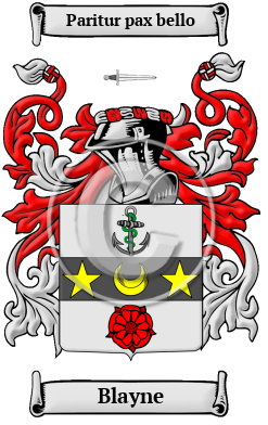 | Blayne History, Family Crest & Coats of Arms Etymology of BlayneWhat does the name Blayne mean? The name Blayne comes from the Scottish/English Borderlands and the ancient Boernicians who inhabited them. It is derived from the Gaelic personal name Bleen, which means yellow. Saint Blane (Blaan) was "one of the earliest bishops of Kingarth in Bute, is commemorated in the Martyrology of Oengus at August 10: 'With a host, sound, of noble birth, well-coloured, fair Blaan of Kingarth.' His name is from bid, that is yellow, from blavos. He is probably also the saint commemorated in the Calendar of Gorman as Blaan buadach Breton, 'triumphant Blaan of the Britons.' He gave name to Kilblane in Southend, Kintyre, and to Dunblane. According to a Bute legend he was mysteriously begotten of a water-sprite." 1 Early Origins of the Blayne familyThe surname Blayne was first found in Ayrshire and Wigtownshire where the name is a "reduced form of MacBlain." 1 One of the first records of the family was that of "Blahan, presbyter of Litun probably Linton in Roxburghshire witnessed a quitclaim by Robert, Bishop of St. Andrews, 1127." 1 "Patrick Blane was provost of the burgh of Wigtown in 1561, and John Blain had a charter of the half of the ten-mark lands of Meikle-Wig in the parish of Whithorn in 1674. Agnes Blain [was] in the parish of Kirkcudbright, 1684." 1 Across the border in Yorkshire, England Andrew Blayne, Bleyn was listed in the Assize Rolls for 1219 and Nicholas Bleyne Was recorded in the Hundredorum Rolls for Suffolk in 1275. Hamo de Blein was listed in the Curia Regis Rolls for Kent in 1219. Later John Blayne was found in the Feet of Fines for Essex in 1507. Down here, it is thought that the name was derived from the Old Welsh Bledgint, Middle English Blethyn. 2 While the aforementioned early origins are the traditional understandings of the origin of the family, one source claims the name to be "from the town of Blain, in Bretagne, France. Blaen, in the Welsh, signifies the summit or top; the same as pen, brig, and bar, the highest part of a mountain; the end or top of an object; the inland extremity of a glen; a leader or chief." 3 Early History of the Blayne familyThis web page shows only a small excerpt of our Blayne research. Another 104 words (7 lines of text) covering the years 1561, 1660, 1674, 1749, 1750, 1771, 1778, 1780, 1793, 1795, 1834, 1835 and 1890 are included under the topic Early Blayne History in all our PDF Extended History products and printed products wherever possible. Blayne Spelling VariationsOver the years, Blayne has been written It appears under these variations because medieval scribes spelled names according to sound rather than by any over-arching set of rules. Blain, Blane, Blaine, Blaines, Blahan and others. Early Notables of the Blayne familySir Gilbert Blane (1749-1834), Scottish physician, the fourth son of Mr. Gilbert Blane of Blanefield, Ayrshire, where he was born on 29 Aug. 1749. At the age of fourteen he was sent to the University of Edinburgh, being at first intended for the church, but was ultimately led to study medicine. After spending five years in the faculty of arts, and five more in that of medicine at Edinburgh, he took the degree of M.D. in the university of Glasgow on 28 Aug. 1778. During his studentship he was elected one of the presidents of the (Students') Medical Society of Edinburgh... Another 155 words (11 lines of text) are included under the topic Early Blayne Notables in all our PDF Extended History products and printed products wherever possible. Migration of the Blayne family to IrelandSome of the Blayne family moved to Ireland, but this topic is not covered in this excerpt. Another 60 words (4 lines of text) about their life in Ireland is included in all our PDF Extended History products and printed products wherever possible. Migration of the Blayne familyWhen these Boernician-Scottish settlers arrived in North America they brought little with them and often had restart their lives from scratch. Through time, much of their heritage was lost, and it is only this century through Clan societies and highland games that many have recovered their national heritage. Research into various historical records has revealed some of first members of the Blayne family to immigrate North America: James Blaine who settled in Pennsylvania in 1740; Eliza Blain who settled in New York in 1774; Peter Blain settled in Philadelphia in 1805; John Blain settled in New Orleans in 1820.