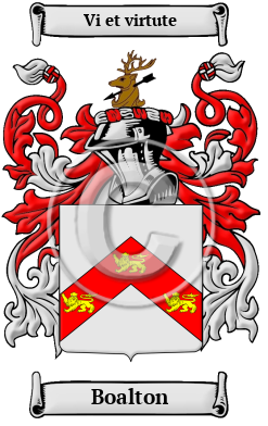 | Boalton History, Family Crest & Coats of Arms Etymology of BoaltonWhat does the name Boalton mean? The lineage of the name Boalton begins with the Anglo-Saxon tribes in Britain. It is a result of when they lived in Lancashire and Yorkshire, where they derived their name from any of several places named Boulton or Bolton. The name literally means district characterized by bends from the Old English words boga and land. 1 There are numerous place names throughout the north of England named after this illustrious family including Bolton le Sands in Lancashire, Bolton Castle, Bolton Percy and Bolton upon Dearne in Yorkshire. The Domesday Book of 1086 refers to Bodeltone 2 and it is generally understood that this if the first reference for most of these places. Early Origins of the Boalton familyThe surname Boalton was first found in Lancashire, Yorkshire, Cumberland and Northumberland. The latter "is memorable as the scene of a meeting in 1209, between John, King of England, and William, King of Scotland." 3 The Boldon Book was prepared on orders of Hugh du Puiset, Bishop of Durham in 1183 and while similar to the Domesday Book from a century before, the book lists lands and properties of what would later become County Durham which is now known as the North East. Only four known manuscript copies exist today. The Hundredorum Rolls of 1273 had two listings for the family: Michael de Boulton, Yorkshire; and Thomas de Boulton, or Bolton, Lincolnshire. 4 In Scotland, the name was "probably from Bolton in East Lothian. Adam de Boultone was reeve of Dunfres, 1287. William fiz Geffray de Boultone del counte de Edeneburk rendered homage, 1296. John of Boulton was employed as a mason at Castle of Linlithgow, 1302, and Robert of Bolton, a Scot, was released from prison in Colchester, 1396." 5 More recently, some of the family were found at Wrightington in Lancashire. "Harrock Hall, the seat of the Boulton family, was purchased in 1839 from the Rigbys, of whom, in 1567, it had already been the residence for four generations: the house, around which are 420 acres, has been restored by the present possessor." 3 Early History of the Boalton familyThis web page shows only a small excerpt of our Boalton research. Another 167 words (12 lines of text) covering the years 1191, 1321, 1570, 1572, 1575, 1592, 1606, 1611, 1619, 1631, 1633, 1639, 1640, 1645, 1648, 1650, 1654, 1659, 1666, 1680, 1844, 1868, 1878 and 1890 are included under the topic Early Boalton History in all our PDF Extended History products and printed products wherever possible. Boalton Spelling VariationsOnly recently has spelling become standardized in the English language. As the English language evolved in the Middle Ages, the spelling of names changed also. The name Boalton has undergone many spelling variations, including Boulton, Bolton, Bolten, Boalton, Boultoun, Boultown, Boltan, Boulten and many more. Early Notables of the Boalton familyEdmund Bolton or Boulton (1575?-1633?), an English historian and poet, born in or about 1575;