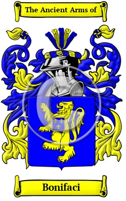 | Bonifaci History, Family Crest & Coats of Arms Etymology of BonifaciWhat does the name Bonifaci mean? The distinguished surname Bonifaci can be traced back to the ancient and beautiful region of Sicily, which is located off Southwestern Italy and incorporates the island of Sicily itself, the area of Naples, and the southern part of the Italian peninsula. Although people were originally known only by a single name, it became necessary for people to adopt a second name to identify themselves as populations grew and travel became more frequent. The process of adopting fixed hereditary surnames was not complete until the modern era, but the use of hereditary family names in Italy began in the 10th and 11th centuries. Italian hereditary surnames were developed according to fairly general principles and they were characterized by a profusion of derivatives coined from given names. The most common type of family name found in the region of Sicily is the patronymic surname, which is derived from the father's given name. During the Middle Ages, Italians adopted the patronymic system of name-making because it perfectly complemented the prevailing Feudal System. In Italy the popularity of patronymic type of surname is also due to the fact that during the Christian era, people often named their children after saints and biblical figures. The surname Bonifaci was derived from the baptismal name which means the "good, faithful man." As the naming tradition grew in Europe baptismal names began to be introduced in many countries. Baptismal names were sometimes given in honor of Christian saints and other biblical figures. There are very few Christian countries in Europe that did not adopt surnames from these religious figures. Early Origins of the Bonifaci familyThe surname Bonifaci was first found in the city of Messina, where early records show Matteo Bonifacio was a lawyer, a judge and was Baron of Casale. His brother Nicolo Bonifacio was senator of Messina around 1450. Early History of the Bonifaci familyThis web page shows only a small excerpt of our Bonifaci research. The years 1465, 1517, 1535 and 1547 are included under the topic Early Bonifaci History in all our PDF Extended History products and printed products wherever possible. Bonifaci Spelling VariationsItalian surnames have a surprising number of forms in comparison with other European surnames because they reflect the regional variations and the many dialects of the Italian language, each of which has its distinctive features. For example, in Northern Italy the most standard Italian surname suffix is "I", whereas in Southern Italy the most typical surname suffix is "O". Sardinian is very different from other forms of Italian and in fact, it is considered to be its own distinct language. Additionally, spelling changes frequently occurred because medieval scribes, church officials, and the bearers of names, spelled names as they sounded rather than according to any specific spelling rules. As a consequence of the major changes in the Italian language and in the local spellings of Italian surnames that occurred over the course of history, there are numerous variations for the surname Bonifaci. These spelling variations include Bonifaci, Bonifacio, Bonifacci, Bonifazio, Bonifazi, Bonifazzi, Bonifati, Bonifacino, Bonfatti and many more. Early Notables of the Bonifaci family- Roberto Bonifacio, a castleowner and member of the nobility in Naples around 1465