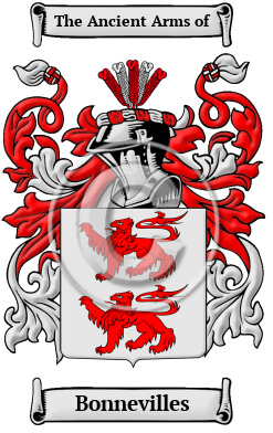 The surname Bonnevilles was first found in Normandy (French: Normandie), the former Duchy of Normandy, where the family has been a prominent family for centuries. The Itineraire de la Normandie records three places so called-two near Rouen and the third near Yvetot. The family were well established in the region of Calvados. They held the Castle of Bonneville or Bondeville in Normandy. 1