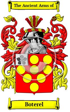 | Boterel History, Family Crest & Coats of Arms Etymology of BoterelWhat does the name Boterel mean? Boterel is an ancient Norman name that arrived in England after the Norman Conquest of 1066. The Boterel family lived in Cornwall. The family name originated in the village of Bottereaux, Normandy. Up until the 12th century, the name was frequently listed as De Boterillis but the family bore the same Arms. One of the first records of the name was Geoffry Boterel, brother of Alan, Count of Pentievre as listed in 1080. His son Hamon was father to William Botterill again mentioned in England in 1130. This William married Alice, a co-heir of Robert Corbet and through the family the Earl of Cornwall was descended. Early Origins of the Boterel familyThe surname Boterel was first found in Cornwall. However, there is records of Aston Botterell, which is a village and small civil parish in Shropshire, and according to the 2001 census it had a population of 74. During the reign of Henry III, it held the rank of a market town. "This place derives the adjunct to its name from the family of Botterell, by whom the manor was held under the earls of Arundel in the reign of Henry III." 1 The manor at that time belonging to the family of the Botterells. The parish of Minster in Cornwall is of some early significance to the family. "This parish, which is situated on the shore of the Bristol Channel, and includes a portion of the small sea-port of Boscastle, was distinguished for a castle built by the family of Bottreaux in the reign of Henry I., of which nothing but the site remains." 1 Continuing, "in the grounds of Worthyvale is a stone bearing some rudely-sculptured characters, brought from Slaughter Bridge, in the neighbourhood, and supposed to commemorate a battle fought near that place, in 525, between the Britons and the Saxons, in which King Arthur is said to have been mortally wounded." 1 "Reginald gave [the manor of ] Penheale [in the parish of Egloskerry, Cornwall] to William Botterell or Bottreaux, the husband of his aunt Alice Corbet ; and it was afterwards confirmed by him to William Botterell the son, who in 1199 gave a fine of 300 marks and two goshawks for livery of this manor and others in Cornwall. " 2 "The estate of Trevethow, [in the parish of Lelant, Cornwall] which is sometimes called the manor of Lelant and Trevethow, belonged at a very early period to the ancient family of Bottreaux; after which it became successively the property of Godolphin and Praed." 2 In Devon, "Molland, or Molland Bottreaux, had a dominant position in the hundreds of North Molton, Braunton, and Bampton. Before the Conquest it belonged to Harold, and it passed to William. Shortly after the Conquest it came to the Bottreauxs, whence its second name, and continued in that ancient house until the reign of Henry VI. The church was given by William de Bottreaux to Hartland Abbey. " 3 Early History of the Boterel familyThis web page shows only a small excerpt of our Boterel research. Another 323 words (23 lines of text) covering the years 1104, 1115, 1120, 1130, 1147, 1155, 1158, 1164, 1193, 1197, 1198, 1203, 1273, 1277, 1302, 1337, 1367, 1389, 1391, 1395, 1415, 1462, 1500, 1643 and 1672 are included under the topic Early Boterel History in all our PDF Extended History products and printed products wherever possible. Boterel Spelling VariationsMultitudes of spelling variations are a hallmark of Anglo Norman names. Most of these names evolved in the 11th and 12th century, in the time after the Normans introduced their own Norman French language into a country where Old and Middle English had no spelling rules and the languages of the court were French and Latin. To make matters worse, medieval scribes spelled words according to sound, so names frequently appeared differently in the various documents in which they were recorded. The name was spelled Botterill, Bottreaux, Boterel, Boterell, Botterell, Botereus and many more. Early Notables of the Boterel family- William Boterell, a prominent 13th century landholder in Shropshire