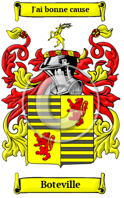 | Boteville History, Family Crest & Coats of Arms Etymology of BotevilleWhat does the name Boteville mean? Boteville is a name of ancient Norman origin. It arrived in England with the Norman Conquest of 1066. The Boteville family lived in Shropshire. The name, however, is a strange contraction of the phrase of the Inn, resulting from the fact that an early member of the family was the proprietor of such an establishment. "The name is derived from the mansion or inn at Stretton, in the county of Salop, (Shropshire) to which the freehold lands of the family, with various detached copyholds, were attached. " 1 Early Origins of the Boteville familyThe surname Boteville was first found in Shropshire where they were Lords of the Manor of Church Stretton. Traditionally, the name was originally Botfield or Botville, and Geoffrey and Oliver Bouteville came into England from a distinguished family in Pictou in France about 1180. 1 2 "The appearance of this name on the Abbey Roll seems sadly at variance with the statement of Matthew Paris, who records that the first of the Botevilles who came to England were two brothers, both of knightly rank, Geoffrey and Oliver Boteville, who brought a body of foreign auxiliaries from Poitou and Gascone, to assist King John against his rebellious barons. Sir Geoffrey, the elder brother, appears to have received a grant of the lands of William D'Albini, Earl of Arundel, at Shelton, in Shropshire, and was constituted Governor of Belvoir Castle. From his grandson, John Botevile, recorded among the knights of Shropshire, present at the siege of Caerlaverock Castle, derived John Botevile, who, from his residence in one of the Inns of Court, acquired the soubriquet of "John of th' Inne," and thence came the surname of Thynne, as now borne by John's descendant, the Marquee of Bath. The Botfeilds, of Hopton Court. co. Salop, and Norton Hall, co. Northampton, who formerly spelt their name Botevile, deduce their line from the old knightly race." 3 Another source confirms the Boteville, Thynne relationship noted above. 2 Ironically the two names which are not phonetically similar which is usually the case became interchangeable, bearing the same history. Early History of the Boteville familyThis web page shows only a small excerpt of our Boteville research. Another 94 words (7 lines of text) covering the years 1544, 1546, 1547, 1578, 1601, 1605, 1608, 1610, 1629, 1639, 1640, 1660, 1669, 1670 and 1714 are included under the topic Early Boteville History in all our PDF Extended History products and printed products wherever possible. Boteville Spelling VariationsIt is only in the last few hundred years that the English language has been standardized. For that reason, Anglo-Norman surnames like Boteville are characterized by many spelling variations. Scribes and monks in the Middle Ages spelled names they sounded, so it is common to find several variations that refer to a single person. As the English language changed and incorporated elements of other European languages such as Norman French and Latin, even literate people regularly changed the spelling of their names. The variations of the name Boteville include Botfield, Botville, Boteville, Botfeld, Botevile, Thynne, Tyne, Tine, Tynes, O'Tyne, Thinn, O'Thinn, Thin, Then, Them and many more. Early Notables of the Boteville family- William Thynne (d. 1546), editor of Chaucer's works who claimed to have been younger son of John de la Inne. "His family bore the alternative surname of Botfield or Boteville, and he is often called '...