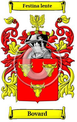France Etymology of BovardWhat does the name Bovard mean? The long and noble heritage behind the name of Bovard first began in medieval France. While the patronymic and metronymic surnames, which are derived from the name of the father and mother respectively, are the most common form of a hereditary surname in France, occupational surnames also emerged during the late Middle Ages. Many people, such as the Bovard family, adopted the name of their occupation as their surname. However, an occupational name did not become a hereditary surname until the office or type of employment became hereditary. The surname Bovard was an occupational name for a person who worked in a cowshed. Looking back further, we find the name Bovard was derived from the Old French word boverie, which means a stable for oxen. Early Origins of the Bovard familyThe surname Bovard was first found in Dauphiny (French: Dauphiné or Dauphiné Viennois), a former province in southeastern France, where bearers of this family name and their ancestors have been located since ancient times. Early History of the Bovard familyThis web page shows only a small excerpt of our Bovard research. Another 357 words (26 lines of text) covering the years 1279, 1376, 1391, 1430, 1500, 1519, 1544, 1648, 1677, 1700, 1717, 1743, 1744 and 1746 are included under the topic Early Bovard History in all our PDF Extended History products and printed products wherever possible. Bovard Spelling VariationsSpelling variations of this family name include: Bouvier, Bouviez, Bouviet, Bouviest, Bouviait, Bouviais, Bouviaie, Bouviaies, Buvier, Buviez, Buviet, Buviest, Buviait, Buviais, Buviaies, Buviaie, Buviaies, Bouvié, Buvié, De Bouvier, Le Bouvier, De Buvier, Le Buvier and many more. Early Notables of the Bovard familyAnother 37 words (3 lines of text) are included under the topic Early Bovard Notables in all our PDF Extended History products and printed products wherever possible.