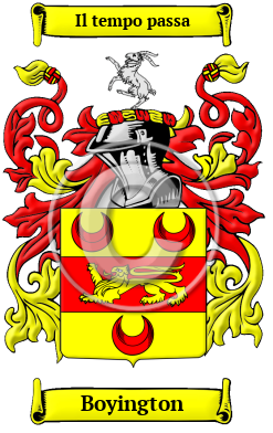 | Boyington History, Family Crest & Coats of Arms Early Origins of the Boyington familyThe surname Boyington was first found in East Riding of Yorkshire at Boynton, a village and civil parish which dates back to the Domesday Book where it was first listed as Bouintone. 1 The Byington variant is Saxon, derived from Bying, a habitation, and ton, a hill or inclosure. 2 "Boynton Hall, the residence of the Baronet, is a lofty and handsome mansion, beautifully situated upon an eminence in a richly wooded park; the acclivities present some fine plantations, and a large sheet of water ornaments the grounds." 3 "Bartholomew de Bovington, living a the beginning of the 12th century, stands at the head of the pedigree; other authorities mention Sir Ingram de Boynton of Aclam who lived in the reign of Henry III, as the first ancestor." 4 The parish of Roxby in the North Riding of Yorkshire had some more early records of the family. "This place, in the Domesday Survey called Rozebi, was formerly the property of the Boynton family, who had a considerable mansion here, and in the reign of Henry V. founded a chapel of ease to the rectory of Hinderwell, of which they were patrons." 3 Much further to the south in the parish of Lanteglos, Cornwall, Robert de Boyton in the reign of Edward I. gave the church of Lanteglos, to the hospital of St. James at Bridgewater. 5 Early History of the Boyington familyThis web page shows only a small excerpt of our Boyington research. Another 83 words (6 lines of text) covering the years 1200, 1471, 1591, 1600, 1618, 1641, 1647, 1664, 1680, 1685, 1689, 1695 and 1731 are included under the topic Early Boyington History in all our PDF Extended History products and printed products wherever possible. Boyington Spelling VariationsSpelling variations of this family name include: Boynton, Boyntun, Bointon, Bointen, Boynten and many more. Early Notables of the Boyington familySir Matthew Boynton, 1st Baronet of Barmston, Yorkshire (1591–1647); Sir Francis Boynton, 2nd Baronet of Barmston, Yorkshire (1618–1695); and his son, Lieutenant-Colonel William Boynton (1641-1689), an English... Another 26 words (2 lines of text) are included under the topic Early Boyington Notables in all our PDF Extended History products and printed products wherever possible. Migration of the Boyington family to IrelandSome of the Boyington family moved to Ireland, but this topic is not covered in this excerpt. More information about their life in Ireland is included in all our PDF Extended History products and printed products wherever possible. Migration of the Boyington familySome of the first settlers of this family name or some of its variants were: William Boynton of Rowley Massachusetts, who settled in 1630 and migrated from Yorkshire; John Boynton settled in Massachusetts in 1630.