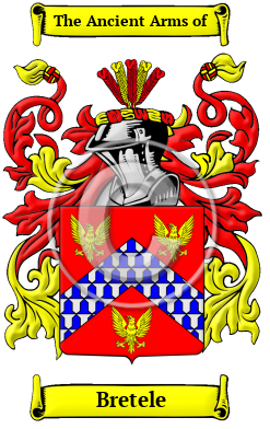 England Early Origins of the Bretele familyThe surname Bretele was first found in Hereford where they held a family seat as Lords of the Manor. After the Battle of Hastings in 1066, William, Duke of Normandy, having prevailed over King Harold, granted most of Britain to his many victorious Barons. It was not uncommon to find a Baron, or a Bishop, with 60 or more Lordships scattered throughout the country. These he gave to his sons, nephews and other junior lines of his family and they became known as under-tenants. They adopted the Norman system of surnames which identified the under-tenant with his holdings so as to distinguish him from the senior stem of the family. After many rebellious wars between his Barons, Duke William, commissioned a census of all England to determine in 1086, settling once and for all, who held which land. He called the census the Domesday Book, 1 indicating that those holders registered would hold the land until the end of time. Hence, conjecturally, the surname is descended from the tenant of many lands and domains who was recorded in the Domesday Book census of 1086. The family is descended from Roger de Breteuil, son of William FitzOsbern, a great Norman Earl. Roger became Earl of Hereford sometime before the Conquest, rebelled against Duke William in 1075, lost his lands, and died in prison. Nevertheless, his kin continued to hold domains in Cornwall, Devon, Dorset and Salop. Early History of the Bretele familyThis web page shows only a small excerpt of our Bretele research. Another 114 words (8 lines of text) covering the year 1904 is included under the topic Early Bretele History in all our PDF Extended History products and printed products wherever possible. Bretele Spelling VariationsSpelling variations of this family name include: Brettell, Bretell, Bretel, Breteuil, Bretull, Britell, Breteel, Breteal, Britill, Brettle, Brittle, Bretale, Brettale and many more. Early Notables of the Bretele familyMore information is included under the topic Early Bretele Notables in all our PDF Extended History products and printed products wherever possible. Migration of the Bretele familySome of the first settlers of this family name or some of its variants were: the name represented in many forms and recorded from the mid 17th century in the great migration from Europe. Migrants settled in the eastern seaboard from Newfoundland, to Maine, to Virginia, the Carolinas, and to the islands..