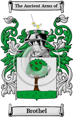 The surname Brothel was first found in County Waterford (Irish: Port Láirge), anciently the Deise region, on the South coast of Ireland in the Province of Munster, where Robert Brohale was a juror in 1312. However, the name was prevalent not much later in east Leinster, where there are records of Philip Brohale, a resident of County Carlow in 1356, John Broghall, a resident of Moone, County Kildare in 1402, and John Brohale, an assessor for the barony of Narragh, County Kildare in 1420. On the English side, Broughall is a small village in Shropshire, England.