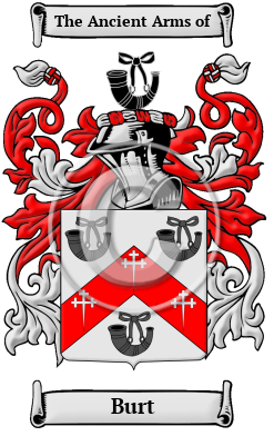 | Burt History, Family Crest & Coats of Arms Etymology of BurtWhat does the name Burt mean? The name Burt reached England in the great wave of migration following the Norman Conquest of 1066. It is based on the Norman personal name and was originally spelled Berte. That name is derived from the word berht, which means light. Hence the name could have been a nickname for someone who was "bright, clear or splendid" having derived from the Anglo Saxon word "beorht." 1 Early Origins of the Burt familyThe surname Burt was first found in Norfolk where Thomas de Burt and Hamo Burt were first listed there in the Hundredorum Rolls of 1273. The same rolls also listed Ralph Burte in Leicestershire and Roger Burt in Oxfordshire. 2 Early History of the Burt familyThis web page shows only a small excerpt of our Burt research. Another 169 words (12 lines of text) covering the years 1066 and 1273 are included under the topic Early Burt History in all our PDF Extended History products and printed products wherever possible. Burt Spelling VariationsThe English language only became standardized in the last few centuries. For that reason, spelling variations are common among many Anglo-Norman names. The shape of the English language was frequently changed with the introduction of elements of Norman French, Latin, and other European languages; even the spelling of literate people's names were subsequently modified. Burt has been recorded under many different variations, including Burt, Burte, Birt, Burts, Berte, Burte, Birte and many more. Early Notables of the Burt family Burt World Rankingthe United States, the name Burt is the 963rd most popular surname with an estimated 29,844 people with that name. 3 However, in Newfoundland, Canada, the name Burt is ranked the 89th most popular surname with an estimated 338 people with that name. 4 And in Australia, the name Burt is the 867th popular surname with an estimated 4,577 people with that name. 5 New Zealand ranks Burt as 404th with 1,627 people. 6 The United Kingdom ranks Burt as 670th with 9,843 people. 7 Migration of the Burt family to IrelandSome of the Burt family moved to Ireland, but this topic is not covered in this excerpt. More information about their life in Ireland is included in all our PDF Extended History products and printed products wherever possible.