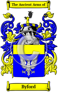 England Etymology of ByfordWhat does the name Byford mean? The ancestors of the Byford surname lived among the ancient Anglo-Saxon culture. The name comes from when they lived near a ford, a shallow place in a river or stream which could be crossed by wading. The surname Byford is derived from the Old English words bi, which means by, and ford, which means ford, collectively "ford near the river-bend."1. The surname Byford may also be derived from residence in the settlement of Byford in Hertfordshire. 2 Early Origins of the Byford familyThe surname Byford was first found in Herefordshire at Byford, a parish, in the union of Weobley, hundred of Grimsworth. 3 The name is derived from Beeford or Beeforth (Buiforde in the Domesday Book) 4 in Holderness in the East Riding of Yorkshire, on the east coast of England. Baldwin de Biford, between 1182 and 1189, "gave as much land on each side of their grange on the moor as was equal to the previous grant of Acer de Biford to Beverley Abbey; Nicholas, his son, gave an oxgang and a toft in Beeford; and Stephen, son of Thomas de Biford, the same." 5 Following this early entry, we must look to Essex for the next registered entry for the family. For it is there that Geoffrey de Biford was listed in the Feet of Fines for 1222-1223. Later, again in Essex, John Byfordim was listed in the Feet of Fines for 1381. 2 Early History of the Byford familyThis web page shows only a small excerpt of our Byford research. Another 75 words (5 lines of text) are included under the topic Early Byford History in all our PDF Extended History products and printed products wherever possible. Byford Spelling VariationsBefore English spelling was standardized a few hundred years ago, spelling variations of names were a common occurrence. Elements of Latin, French and other languages became incorporated into English through the Middle Ages, and name spellings changed even among the literate. The variations of the surname Byford include Biford, Biforde, Byford, Byforde, Bifford, Byfford, Biffard, Biffort, Byfford and many more. Early Notables of the Byford family- William Byford of Biford Hereford
