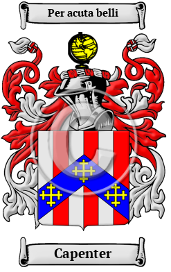 | Capenter History, Family Crest & Coats of Arms Etymology of CapenterWhat does the name Capenter mean? The many generations and branches of the Capenter family can all place the origins of their surname with the ancient Anglo-Saxon culture. Their name reveals that an early member worked as a carpenter derived from the Old French word carpentier. 1 The name was quite popular in Normandy as seen in the Magni Rotuli Scaccarii Normanniae which listed Robert, Gaufrid, Ansketel, Richard, William, Bernard Carpentarius, of Normandy, 1180-95. This Latin form of the name continued into England where Reiner, Adam, Roger, William Carpentarius, of England were listed in the Pipe Rolls of 1189. In fact the Domesday Book of 1086 included Durand Carpentarius, a tenant in capite, Norfolk, and Rabel and Roger Carpentarius at the same time. The latter gave lands to Stoke-Clare Priory, 1090. William Carpentarius was father of Henry and Manasser Biset, Barons t. Henry II. 2 Early Origins of the Capenter familyThe surname Capenter was first found in the Hundredorum Rolls of 1273 which listed Ricardus Carpentarius, Cambridgeshire; and Hugh le Charpenter, Wiltshire. Later the Yorkshire Poll Tax Rolls of 1379 listed: Johannes Carpenter, wryght; and Willelmus Wryght, carpenter. 3 Moving ahead two centuries, researchers found John Carpenter (1370?-1441?), Town Clerk of London, son of Richard Carpenter, a citizen of London. "On 20 April 1417 he was chosen town clerk or common clerk of the city, after having held an inferior post in the town clerk's office for some years previously. " 4 John Carpenter (d. 1476), Bishop of Worcester was born probably at Westbury-on-Trym, Gloucestershire. 4 Early History of the Capenter familyThis web page shows only a small excerpt of our Capenter research. Another 122 words (9 lines of text) covering the years 1121, 1429, 1516, 1570, 1575, 1582, 1588, 1589, 1591, 1621, 1627, 1628, 1649, 1657, 1667, 1671, 1673, 1683, 1714 and 1732 are included under the topic Early Capenter History in all our PDF Extended History products and printed products wherever possible. Capenter Spelling VariationsBefore the last few hundred years, the English language had no fast system of spelling rules. For that reason, spelling variations are commonly found in early Anglo-Saxon surnames. Over the years, many variations of the name Capenter were recorded, including Carpenter, Carpentar, Carpenters, Carpentier and many more. Early Notables of the Capenter familyAlexander Carpenter, Latinized as Fabricius (fl. 1429), author of the 'Destructorium Vitiorum,' a treatise which enjoyed a considerable popularity in the fifteenth and sixteenth centuries, was six times printed before 1516, and was finally reprinted (at Venice) as late as 1582. 4