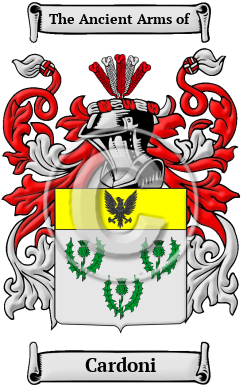Italy Spain Early Origins of the Cardoni familyThe surname Cardoni was first found in Castile, in north central Spain. Early History of the Cardoni familyThis web page shows only a small excerpt of our Cardoni research. Another 125 words (9 lines of text) covering the years 1482 and 1722 are included under the topic Early Cardoni History in all our PDF Extended History products and printed products wherever possible. Cardoni Spelling VariationsSpelling variations of this family name include: Cardona, Cardon, Cardonne, Cardonas, Cardonan, Cardonna and many more. Early Notables of the Cardoni familyMore information is included under the topic Early Cardoni Notables in all our PDF Extended History products and printed products wherever possible.