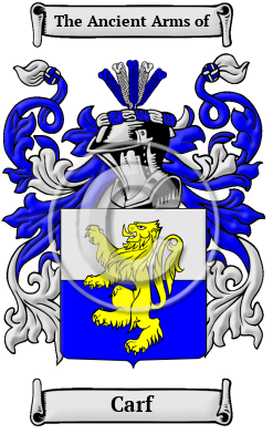 | Carf History, Family Crest & Coats of Arms Early Origins of the Carf familyThe surname Carf was first found in Milan (Italian: Milano, Milanese: Milan), the second-most populous city in Italy and the capital of Lombardy. In those ancient times only persons of rank, the podesta, clergy, city officials, army officers, artists, landowners were entered into the records. To be recorded at this time, at the beginning of recorded history, was of itself a great distinction and indicative of noble ancestry. Another line of this surname was found in the province of Veneto in the 13th century, when members of the Carlotti family were recognized as nobility in the city of Verona. Early History of the Carf familyThis web page shows only a small excerpt of our Carf research. Another 171 words (12 lines of text) covering the years 1466, 1483, 1503, 1514, 1519, 1524, 1554, 1555, 1580, 1590, 1613, 1626, 1630, 1674, 1686, 1697, 1721, 1744, 1750, 1775 and 1777 are included under the topic Early Carf History in all our PDF Extended History products and printed products wherever possible. Carf Spelling VariationsSpelling variations of this family name include: Carli, Carlo, Caroli, Decarli, Di Carlo, De Caroli, De Carolix, Carlino, Carlini, Carlin, Carlucci, Carluccio, Carluzzi, Carlotti, Carlotto, Carlot, Carlozzi, Carloni, Carlone, Carlon, Carlesi, Carlisi and many more. Early Notables of the Carf familyCarlo Innocenzo Carlone (1686-1775), an Italian painter and engraver; Taddeo Carlone (died 1613), Swiss-Italian sculptor and architect; Giovanni Bernardo Carlone (1590-1630), an Italian painter of the late-Mannerist and early-Baroque periods; Andrea Carlone (1626-1697), an Italian painter; Diego Francesco Carlone (1674-1750), an Italian sculptor; Raffaello Carli, a painter born in Vasari in 1466 whose fame escalated once he began working in Florence; a member of the Carluccio family, who was mayor of Matera in 1483; the Carli family of Genoa, hotel owners during the 15th century; Giaffredo di Carlo Carli, a judge, senator, and President of the Senate in Milan from 1503... Another 111 words (8 lines of text) are included under the topic Early Carf Notables in all our PDF Extended History products and printed products wherever possible. Migration of the Carf familySome of the first settlers of this family name or some of its variants were: James Carlon, who came to Philadelphia in 1828; Augt. Carlin, who came to New York in 1832; Ann Carlin, who came in 1842; Giuseppe DiCarlo, who settled in Ashtabula Co., OH sometime between 1875 and 1906.