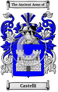 France Italy Etymology of CastelliWhat does the name Castelli mean? The distinguished surname Castelli originated in an area of Italy, known as the Papal States. Although people were originally known only by a single name, it became necessary for people to adapt a second name to identify themselves as populations grew and travel became more frequent. The process of adopting fixed hereditary surnames was not complete until the modern era, but the use of hereditary family names in Italy began in the 10th and 11th centuries. Italian hereditary surnames were developed according to fairly general principles and they are characterized by a profusion of derivatives coined from given names. Although the most traditional type of family name found in the region of the Papal States is the patronymic surname, which is derived from the father's given name, local surnames are also found. Local names, which are the least frequent of the major types of surnames found in Italy, are derived from a place-name where the original bearer once resided or held land. Often Italian local surnames bore the prefix "di," which signifies emigration from one place to another, but does not necessarily denote nobility. The Castelli family lived at or near a "castle." Early Origins of the Castelli familyThe surname Castelli was first found in the year 1070, when Pantaleone Castelli was responsible for the construction of the bronze doors for the church of San Paolo. Early History of the Castelli familyThis web page shows only a small excerpt of our Castelli research. The years 1210, 1211, 1229, 1390, 1420, 1488, 1500, 1521, 1557, 1600, 1608, 1624, 1629, 1659, 1660 and 1672 are included under the topic Early Castelli History in all our PDF Extended History products and printed products wherever possible. Castelli Spelling VariationsSurnames that originated in Italy are characterized by an enormous number of spelling variations. Some of these are derived from regional traditions and dialects. Northern names, for instance, often end in "o", while southern names tend to end in "i". Other variations come from the fact the medieval scribes tended to spell according to the sound of words, rather than any particular set of rules. The recorded variations of Castelli include Castelli, Castello, Castella, Castiello, Castiglio, Del Castello, Del Castiglio, Castelletti, Castelletto, Castelletta, Castellini, Castellino, Castellucci, Casteluccio, Castelluzzi, Castelluzzo, Castellotti, Castellotto, Castellone, Castiglione, Castiglioni, Castioni, Castellacci, Castellaccio, Castellazzi, Castellazzo, Castellani, Castellano, Castellana, Castellàn, Castellaneta, Castellari, Castellaro, Castellarini, Castellarìn, Castelfranco, Castelfranchi, Castelnovo, Castelnuovo, Castelnovi, Castelvecchio, Castelvecchi, Castelvetro and many more. Early Notables of the Castelli family- Alberto Castellani was mayor of Cerea in 1210, 1211, and again in 1229; Pierozzo Castellani was a priest in 1390; Luca Castellano was a priest in 1420; Agostino Castelli of Brescia was a military engi...