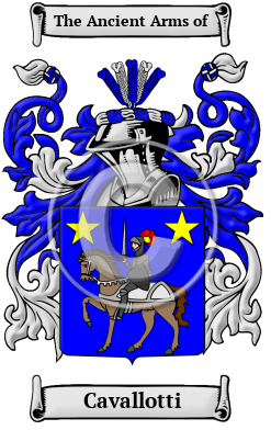| Cavallotti History, Family Crest & Coats of Arms Etymology of CavallottiWhat does the name Cavallotti mean? The surname Cavallotti comes from the words "cavallaro," which means a horse dealer; or from "cavalieri," meaning a horseman, rider or knight. Early Origins of the Cavallotti familyThe surname Cavallotti was first found in at Ferrara, a city and comune in Emilia-Romagna, northern Italy, capital city of the Province of Ferrara, one of the more prosperous cities at this early time. Records locate the Cavalieri family in Ferrara as early as the 9th century, when Giovanni Cavalieri defended his vast lands against the Venetians. Early History of the Cavallotti familyThis web page shows only a small excerpt of our Cavallotti research. The years 1259, 1344, 1450, 1454, 1500, 1508, 1550, 1590, 1602, 1616, 1620, 1656, 1676, 1684, 1735, 1761 and 1775 are included under the topic Early Cavallotti History in all our PDF Extended History products and printed products wherever possible. Cavallotti Spelling VariationsItalian surnames come in far more variations than the names of most other nationalities. Regional traditions and dialects are a decisive factor in this characteristic. For example, northern names tend to end in "o", while southern in "i". Also important, but not unique to Italy, was the fact that before dictionaries and the printing press most scribes simply spelled words according to their sounds. The predictable result was an enormous number of spelling variations. The recorded spellings of Cavallotti include Cavalli, Cavallo, Cavalletti, Cavalletto, Cavallini, Cavallino, Cavallina, Cavallìn, Cavallucci, Cavalluccio, Cavalluzzi, Cavallotti, Cavallotto, Cavallone, Cavallacci, Cavallazzi, Cavallari, Cavallaro, Cavallàr, Cavalleri, Cavallero, Cavaleri, Cavalero, Cavalieri, Cavaliere and many more. Early Notables of the Cavallotti familyPietro Cavallini (1259-1344), a well known painter born in Rome in the 13th century; Sigismondo Cavalli, a Count in Verona around 1450; Gian Marco Cavalli (c.1454- c. 1508), an Italian medallist, sculptor and goldsmith; Giovanni Battista Cavalletto, a painter, sculptor, poet, and musician in Bologna around 1500; Emilio del Cavalieri, (c. 1550-1590), a 16th century composer; Francesco Cavalli (1602-1676), an Italian composer of the early... Another 65 words (5 lines of text) are included under the topic Early Cavallotti Notables in all our PDF Extended History products and printed products wherever possible. Migration of the Cavallotti familyA search of the immigration and passenger lists has shown a number of people bearing the name Cavallotti: Bartolomeo Cavallero, who arrived in New Orleans, Louisiana in 1778 with his wife Maria and his six children; Diego, Antonio, Bartolomeo, Maria, Augustina, Andrea, and Louis Cavalli, who were all naturalized in Detroit in 1833.