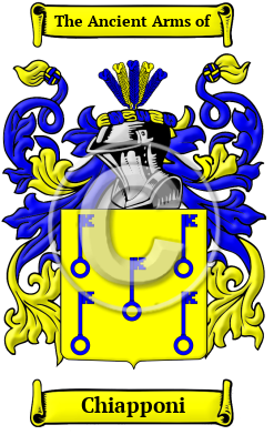 The surname Chiapponi was first found in Aquila, capital of Abruzzi Province of Italy. A city on the valley of the Aterno. The citadel (1535) of the Spanish viceroy Don Pedro de Toledo. The church of St Bewrardin is notable. The fountain outside the town has 99 jets. It was founded Conrad, son of Emperor Frederick II in 1250. The Spaniards captured it in 1503. Sacked by the French in 1799. In those ancient times only persons of rank, the podesta, clergy, city officials, army officers, artists, landowners were entered into the records. To be recorded at this time, at the beginning of recorded history, was of itself a great distinction and indicative of noble ancestry. Originally of Castille in Spain, the Italian was moved of army XVI of Carlo V.