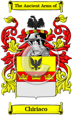 The surname Chiriaco was first found in Calabria, a province at the southern tip of Italy which, though not on the island of Sicily was part of the Kingdom of Two Sicilies. The name is frequently found in other parts of the south of Italy, though some members of the family did move further north. Those that remained in the south kept the southern suffix "-o," while those that moved north adopted the northern convention of ending their name in "-i." Many surnames were taken from the occupation of the person who first took the name. This name is one such name, coming from the Italian word "chierico," meaning "altar boy."