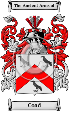 | Coad History, Family Crest & Coats of Arms Etymology of CoadWhat does the name Coad mean? The name Coad is from the rugged landscape of Wales. It is a Celtic name that was derived from Cudde or Codling, which were both pet-forms of the personal name Cuthbert. 1 Another source claims the name is derived from the "Anglo-Saxon personal name Cod, Coda, Codda [Old English codd, meaning a bag]." 2 During the 16th century, a codder was a worker in leather, a saddler, or a peltmonger. Thus, Coad may also be an occupational surname applied to someone involved in one of these trades. Early Origins of the Coad familyThe surname Coad was first found in Cornwall, where they held a family seat from very ancient times. "The manor of Methleigh, [in the parish of Breage, Cornwall] was formerly the property of Sir Thomas Arundell, of Truthall in Sithney, from whom it passed by sale to the family of Coode, about the commencement of the last century. In this family it has since remained, and it is now the property of Edward Coode, Esq. of St. Austell." 3 "In the church [of Morvall, Cornwall there] are memorials for the families of Mayow, Kendall, and Coode. For William Coode who died in 1637, there is a monument containing figures of himself and his wife, in a kneeling attitude. These are in bas relief on slate; behind each of which is a vine, and on four of their principal branches, are death's heads." 3 Early History of the Coad familyThis web page shows only a small excerpt of our Coad research. Another 153 words (11 lines of text) covering the years 1172, 1586, 1635, 1648, 1672, 1689, 1690, 1709, 1765 and 1777 are included under the topic Early Coad History in all our PDF Extended History products and printed products wherever possible. Coad Spelling VariationsWelsh surnames are relatively few in number, but they have an inordinately large number of spelling variations. There are many factors that explain the preponderance of Welsh variants, but the earliest is found during the Middle Ages when Welsh surnames came into use. Scribes and church officials recorded names as they sounded, which often resulted in a single person's name being inconsistently recorded over his lifetime. The transliteration of Welsh names into English also accounts for many of the spelling variations: the unique Brythonic Celtic language of the Welsh had many sounds the English language was incapable of accurately reproducing. It was also common for members of a same surname to change their names slightly, in order to signify a branch loyalty within the family, a religious adherence, or even patriotic affiliations. For all of these reasons, the many spelling variations of particular Welsh names are very important. The surname Coad has occasionally been spelled Code, Codd, Codde, Coad, Coade and others. Early Notables of the Coad familyCode of Gridley Castle in Devon; and John Coode (c. 1648-1709), born in Penryn, Cornwall, he left England for America in 1672 to lead a rebellion that overthrew... Another 27 words (2 lines of text) are included under the topic Early Coad Notables in all our PDF Extended History products and printed products wherever possible. Migration of the Coad family to IrelandSome of the Coad family moved to Ireland, but this topic is not covered in this excerpt. Another 98 words (7 lines of text) about their life in Ireland is included in all our PDF Extended History products and printed products wherever possible.