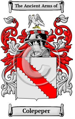 England Etymology of ColepeperWhat does the name Colepeper mean? The name Colepeper has been recorded in British history since the time when the Anglo-Saxons ruled over the region. The name is assumed to have been given to someone who was a spicer. The name is derived from two Old English elements, cul and pepper. It meant "pepper gatherer." 1 As spices were rare and expensive in the medieval period, this would have been a valued occupation. Early Origins of the Colepeper familyThe surname Colepeper was first found in Kent where the family descend from Culpepers of Bay Hall, Pembury, Kent. It is generally thought that the first record of the family was John de Colepepper (c. 1140) from Bay Hall, Pepenbury. His son, Sir Thomas de Colpepper (1170-c.1200) was Recognitor of the Grand Assize in Sussex. He died in Sussex at the age of 30. Bay Hall Manor was held by the family until 1480 when it was sold Humphrey Stafford, Duke of Buckingham. In West Peckham, Kent, a Commandery of Knights Hospitallers was founded in 1408, by John Colepepper, one of the judges of the Common Pleas. 2 Early History of the Colepeper familyThis web page shows only a small excerpt of our Colepeper research. Another 161 words (12 lines of text) covering the years 1290, 1321, 1588, 1600, 1601, 1616, 1632, 1635, 1644, 1651, 1654, 1656, 1660, 1663, 1668, 1670, 1677, 1683, 1689, 1700, 1723, 1725 and 1740 are included under the topic Early Colepeper History in all our PDF Extended History products and printed products wherever possible. Colepeper Spelling VariationsThe first dictionaries that appeared in the last few hundred years did much to standardize the English language. Before that time, spelling variations in names were a common occurrence. The language was changing, incorporating pieces of other languages, and the spelling of names changed with it. Colepeper has been spelled many different ways, including Colepeper, Colpepper, Culpeper, Culpepper, Colepepper, Colpeper, Collpeper and many more. Early Notables of the Colepeper family- Sir Geoffrey Colepeper High Sheriff of Kent