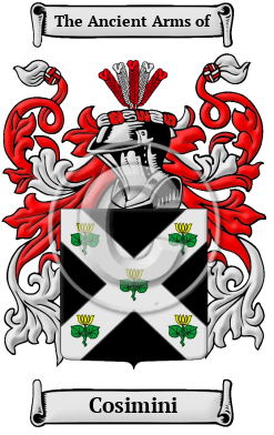 | Cosimini History, Family Crest & Coats of Arms Etymology of CosiminiWhat does the name Cosimini mean? The distinguished surname Cosimini can be traced back to the ancient and beautiful region of Venice. Although people were originally known only by a single name, it became necessary for people to adopt a second name to identify themselves as populations grew and travel became more frequent. The process of adopting fixed hereditary surnames was not complete until the modern era, but the use of hereditary family names in Italy began in the 10th and 11th centuries. Italian hereditary surnames were developed according to fairly general principles and they were characterized by a profusion of derivatives coined from given names. The most common type of family name found in the region of Venice is the patronymic surname, which is derived from the father's given name. During the Middle Ages, Italians adopted the patronymic system of name-making because it perfectly complemented the prevailing Feudal System. In Italy the popularity of patronymic type of surname is also due to the fact that during the Christian era, people often named their children after saints and biblical figures. The surname Cosimini came from the given name Cosma, which is derived from the Latin Cosmas, which means harmony. Early Origins of the Cosimini familyThe surname Cosimini was first found in Padua (Italian: Padova, Latin: Patavium, Venetian: Padoa), on the Bacchiglione River, capital of the province of Padua, when Niccol Cosmico was a famous poet there in 1420. Early History of the Cosimini familyThis web page shows only a small excerpt of our Cosimini research. More information is included under the topic Early Cosimini History in all our PDF Extended History products and printed products wherever possible. Cosimini Spelling VariationsEnormous variation in spelling and form characterizes those Italian names that originated in the medieval era. This is caused by two main factors: regional tradition, and inaccuracies in the recording process. Before the last few hundred years, scribes spelled names according to their sounds. Spelling variations were the unsurprising result. The variations of Cosimini include De Cosimo, Cosma, Cosmo, Cosmi, Cusma, Cosimo, Cosimi, De Cosmo, De Cosmis, Cosmelli, Cosimelli, Cosmini, Cosmin, Gosmin, Gusmin, Cosimini, Cosimato, Cosmano, Cosmani, Cosini, Cusmano, Gusmani, Cusimano, Cusumano and many more. Early Notables of the Cosimini familyAnother 40 words (3 lines of text) are included under the topic Early Cosimini Notables in all our PDF Extended History products and printed products wherever possible. Migration of the Cosimini familyImmigrants bearing the name Cosimini or a variant listed above include: Felix Cosme, aged 30, who arrived at Ellis Island, in 1924; Francisco Cosme, aged 19, who arrived at Ellis Island, in 1917; and Heleni Cosme, aged 25, who arrived at Ellis Island, in 1909..