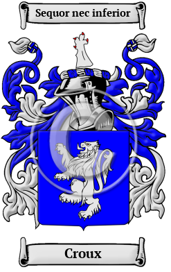 England Etymology of CrouxWhat does the name Croux mean? The ancestors of the bearers of the Croux family name are thought have lived in ancient Anglo-Saxon England. They were first found as dwellers at a cattle-pen or cattle-fold. 1 Early Origins of the Croux familyThe surname Croux was first found in Cheshire where the "ancestors of Lord Crewe were Lords of Crewe, co. Chester, 13 Edward I." (during the thirteenth year of King Edward I's reign.) 2 Today, Crewe is a township, in the parish of Barthomley, union and hundred of Nantwich in Cheshire. "It has been the inheritance of the Crewe family from a very early period. The Hall, the seat of Lord Crewe, exhibits a good specimen of the more enriched style of architecture which prevailed in the early part of the 17th century: it was begun in 1615, and completed in 1636, and the ceilings and wainscots of many of the rooms, and the principal staircase, retain their original decorations. The gallery, a hundred feet in length, is fitted up as a library, and contains a number of family portraits, and fine pictures: the mansion has also a private chapel, where divine service is performed every Sunday morning, and where is a large painting of the Last Supper, with two beautiful specimens of ancient stained glass. " 3 Looking back further researchers found the name actually dates back to Norman times as "Crewe was in the barony of Malbanc, and was possessed c. 1150 by Henry de Criwa, who attested a charter of Hugh Malbanc. Sire Thomas de Crue was living after 1241. Hence the Lords Crewe of Stene, maternally represented by the Lords Crewe." 4 Early History of the Croux familyThis web page shows only a small excerpt of our Croux research. Another 175 words (12 lines of text) covering the years 1558, 1565, 1598, 1623, 1624, 1625, 1633, 1634, 1646, 1656, 1671, 1674, 1679, 1697 and 1721 are included under the topic Early Croux History in all our PDF Extended History products and printed products wherever possible. Croux Spelling VariationsUntil quite recently, the English language has lacked a definite system of spelling rules. Consequently, Anglo-Saxon surnames are characterized by a multitude of spelling variations. Changes in Anglo-Saxon names were influenced by the evolution of the English language, as it incorporated elements of French, Latin, and other languages. Although Medieval scribes and church officials recorded names as they sounded, so it is common to find one person referred to by several different spellings of his surname, even the most literate people varied the spelling of their own names. Variations of the name Croux include Crewe, Crew, Croux, Crewes, Creuse and others. Early Notables of the Croux familySir Randulphe or Randolph Crew or Crewe (1558-1646), English judge, second son of John Crew of Nantwich, who is said to have been a tanner; Sir Thomas Crewe (or Crew) (1565-1634), of Stene in Northamptonshire, an English Member of Parliament and lawyer, Speaker of the House of Commons from 1623 to 1625; John... Another 53 words (4 lines of text) are included under the topic Early Croux Notables in all our PDF Extended History products and printed products wherever possible. Migration of the Croux familySearching for a better life, many English families migrated to British colonies. Unfortunately, the majority of them traveled under extremely harsh conditions: overcrowding on the ships caused the majority of the immigrants to arrive diseased, famished, and destitute from the long journey across the ocean. For those families that arrived safely, modest prosperity was attainable, and many went on to make invaluable contributions to the development of the cultures of the new colonies. Research into the origins of individual families in North America revealed records of the immigration of a number of people bearing the name Croux or a variant listed above: Randall Crew who settled in Virginia in 1621; John Crewe was farming in Virginia in 1642; followed by Thomas Crew in 1652; William Crew settled in Barbados in 1660.