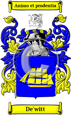| De'witt History, Family Crest & Coats of Arms Etymology of De'wittWhat does the name De'witt mean? De'witt is one of the names that was brought to England in the wave of migration following the Norman Conquest of 1066. The De'witt family name comes from the ancient personal name Julien. The surname of Jowett was a baptismal name which means Julien. 1 Alternatively, the name could have been derived from the French "jouet" which means "play, sport, fun." English records we find both Jouet and Jowet." 2 Another source agrees with this direction. The Magni Rotuli Scaccarii Normanniae lists Geoffry Guuit (or Guet), Normandy, 1180-95. "Matilda Joute, Richard Joyet, William Juet, Engl. c. 1272." 3 Early Origins of the De'witt familyThe surname De'witt was first found in Cheshire where they held a family seat as Lords of the manor of Bredbury from early times. The lands were granted by William the Conqueror to a Norman noble by the name Jouet, from the Isle of Rhe in France. By the twelfth century they had branched to Ashton-under-Lyme in that same shire. Early English rolls provide us a glimpse of the spelling variations used through Medieval times. Today we typically need to look beyond the spellings of these entries and concentrate on a phonetic appreciation of the names. The Hundredorum Rolls of 1273 had only one listing: William Juet, Huntingdonshire. 4 William Jouet was listed in the Assize Rolls for Staffordshire in 1229 and the next year, Richard Jouot was listed in the same county in the Assize Rolls of 1300. In Kent, Goger Guet was found in the Assize Rolls for 1317 and later, Robert Jowet was found in the Yorkshire Poll Tax Rolls of 1379. 1 Early History of the De'witt familyThis web page shows only a small excerpt of our De'witt research. Another 118 words (8 lines of text) covering the years 1451, 1452, 1591, 1592, 1613, 1614, 1631, 1639, 1641, 1643, 1675, 1693, 1694, 1701 and 1720 are included under the topic Early De'witt History in all our PDF Extended History products and printed products wherever possible. De'witt Spelling VariationsThe English language only became standardized in the last few centuries. For that reason, spelling variations are common among many Anglo-Norman names. The shape of the English language was frequently changed with the introduction of elements of Norman French, Latin, and other European languages; even the spelling of literate people's names were subsequently modified. De'witt has been recorded under many different variations, including Jowett, Jowet, Jowit, Jowitt, Jewett, Jewet, Juet, Jouet, Juett and many more. Early Notables of the De'witt familyNehemiah Jewett (1643-1720), an American colonial politician, Speaker of the Massachusetts House of Representatives (1693-1694) and in 1701; during his tenure, he was responsible for compensating those damaged by the Salem witch trials.