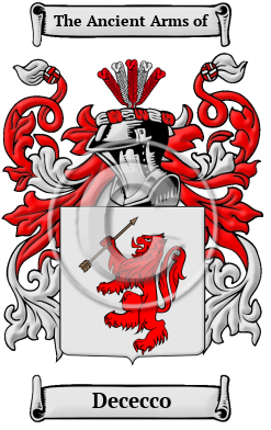 | Dececco History, Family Crest & Coats of Arms Etymology of DececcoWhat does the name Dececco mean? The distinguished surname Dececco originated in an area of Italy, known as the Papal States. Although people were originally known only by a single name, it became necessary for people to adapt a second name to identify themselves as populations grew and travel became more frequent. The process of adopting fixed hereditary surnames was not complete until the modern era, but the use of hereditary family names in Italy began in the 10th and 11th centuries. Italian hereditary surnames were developed according to fairly general principles and they are characterized by a profusion of derivatives coined from given names. The most traditional type of family name found in the region of the Papal States is the patronymic surname, which is derived from the father's given name. During the Middle Ages, Italians adopted the patronymic system of name-making because it perfectly complemented the prevailing Feudal System. In Italy the popularity of patronymic type of surname is also due to the fact that during the Christian era, people often named their children after saints and biblical figures. The surname Dececco came from the given name "Cecco," which in turn is a variant of "Francesco," or "Francis." Early Origins of the Dececco familyThe surname Dececco was first found in the city of Rome, where earliest records date back to Rinaldo Ceci, who moved his family to Velletri when he was appointed mayor of the city. Early History of the Dececco familyThis web page shows only a small excerpt of our Dececco research. The years 1450, 1518 and 1800 are included under the topic Early Dececco History in all our PDF Extended History products and printed products wherever possible. Dececco Spelling VariationsIn comparison with other European surnames, Italian surnames have a surprising number of forms. They reflect the regional variations and the many dialects of the Italian language, each with its own distinctive features. For example, in Northern Italy the typical Italian surname suffix is "i", whereas in Southern Italy it is "o". Additionally, spelling changes frequently occurred because medieval scribes and church officials often spelled names as they sounded rather than according to any specific spelling rules. The spelling variations in the name Dececco include Cecchi, Cecco, Di Cecco, Ceco, Ceci, Cecchelli, Cecchelìn, Checcherini, Checchetti, Cecchetti, Cecchetto, Cecchèt, Cechèt, Cecchettìn, Ceccatelli, Cecchini, Cecchin, Cecchinelli, Cecchinato, Ceccaldi, Ceccardi, Ceccanti, Ceccantini, Ceccato, Cecàt and many more. Early Notables of the Dececco familyDomenico Cecchi, a Florentine businessman around 1450; Giovanni Maria Cecchi, a famous playwright born in Florence in 1518; the Cecchi family of Aqua Fresca, who owned the most prestigious weapons factory in Italy during the... Another 35 words (2 lines of text) are included under the topic Early Dececco Notables in all our PDF Extended History products and printed products wherever possible. Migration of the Dececco familyAnalysis of immigration records indicates that some of the first North American immigrants bore the name Dececco or a variant listed above: Ann Ceco, who arrived in Virginia in 1663; Enrico Checchetti, a famous dancer who arrived in Philadelphia, Pennsylvania with his parents in 1857; Abdon Cecchini, aged 17, who arrived at Ellis Island from Varsi, Italy, in 1913.