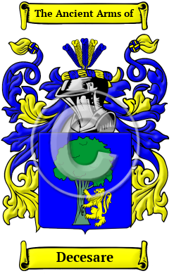| Decesare History, Family Crest & Coats of Arms Etymology of DecesareWhat does the name Decesare mean? The distinguished surname Decesare can be traced back to the ancient and beautiful region of Sicily, which is located off Southwestern Italy and incorporates the island of Sicily itself, the area of Naples, and the southern part of the Italian peninsula. Although people were originally known only by a single name, it became necessary for people to adopt a second name to identify themselves as populations grew and travel became more frequent. The process of adopting fixed hereditary surnames was not complete until the modern era, but the use of hereditary family names in Italy began in the 10th and 11th centuries. Italian hereditary surnames were developed according to fairly general principles and they were characterized by a profusion of derivatives coined from given names. The most common type of family name found in the region of Sicily is the patronymic surname, which is derived from the father's given name. During the Middle Ages, Italians adopted the patronymic system of name-making because it perfectly complemented the prevailing Feudal System. In Italy the popularity of patronymic type of surname is also due to the fact that during the Christian era, people often named their children after saints and biblical figures. The surname Decesare was derived from the given name "Cesare," and originally derived from the famous Roman family name "Caesar." In Classical times, the name "Caesar" was associated by folk etymology with the Latin Caesaries (head of hair). Early Origins of the Decesare familyThe surname Decesare was first found in the year 1278, where Nicol Cesareo was listed in the Sicilian city of Messina. Nicol Cesari, was a priest in Rome during the 14th century and worked closely with Pope Martino V. Later, Giulio Cesarini was a listed as a lawyer in Rome around 1400. Early History of the Decesare familyThis web page shows only a small excerpt of our Decesare research. The years 1398, 1444, 1466, 1470, 1510, 1542, 1568, 1571, 1600, 1622, 1640, 1650 and 1750 are included under the topic Early Decesare History in all our PDF Extended History products and printed products wherever possible. Decesare Spelling VariationsItalian surnames come in far more variations than the names of most other nationalities. Regional traditions and dialects are a decisive factor in this characteristic. For example, northern names tend to end in "o", while southern in "i". Also important, but not unique to Italy, was the fact that before dictionaries and the printing press most scribes simply spelled words according to their sounds. The predictable result was an enormous number of spelling variations. The recorded spellings of Decesare include Cesari, Cesare, Cesaro, Cesar, De Cesare, Cesaris, De Cesaris, Di Cesare, Cesarelli, Cesaretti, Cesarini, Cesarino, Cesarìn, Cesarotti, Cesaroni, Cesarone, Cesarano, Cesarato, Cesaratto, Cesariano, Cesareni and many more. Early Notables of the Decesare familyGiuliano Cesarini was an ecclesiastic in Rome in 1470; Julian Cesarini the Elder (1398-1444), was an Italian cardinal from Rome; his son, Julian Cesarini the Younger (1466-1510) was an Italian Roman Catholic cardinal; Alessandro Cesarini (died 1542), was an Italian cardinal of the Roman Catholic Church and Bishop of Pistoia; Cesare Cesarino of Varese was a prominent architect, military engineer, and painter during the early 16th century;