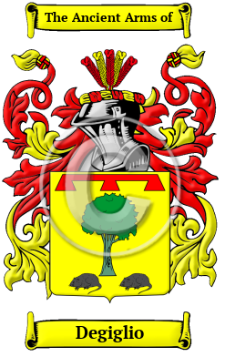 The surname Degiglio was first found in Ferrara, a city and comune in Emilia-Romagna, northern Italy, capital city of the Province of Ferrara. History dates the city back to 753. It was at war with Venice in 1471. It is a walled city and notable is the Church of S.Cristoforo. Knitted goods and shawls are made. In those ancient times only persons of rank, the podesta, clergy, city officials, army officers, artists, landowners were entered into the records. To be recorded at this time was in itself a family honor. The Giglio family originated in Pellicciari but little is known of their early history. They became seated in Ferrara in 1184 during the Norman occupation.