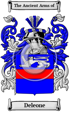 | Deleone History, Family Crest & Coats of Arms Etymology of DeleoneWhat does the name Deleone mean? The distinguished surname Deleone originated in an area of Italy, known as the Papal States. Although people were originally known only by a single name, it became necessary for people to adapt a second name to identify themselves as populations grew and travel became more frequent. The process of adopting fixed hereditary surnames was not complete until the modern era, but the use of hereditary family names in Italy began in the 10th and 11th centuries. Italian hereditary surnames were developed according to fairly general principles and they are characterized by a profusion of derivatives coined from given names. The most traditional type of family name found in the region of the Papal States is the patronymic surname, which is derived from the father's given name. During the Middle Ages, Italians adopted the patronymic system of name-making because it perfectly complemented the prevailing Feudal System. In Italy the popularity of patronymic type of surname is also due to the fact that during the Christian era, people often named their children after saints and biblical figures. The surname Deleone came from the given name Leoni which comes from the Latin Leo or Leonios, which means lion-like. Early Origins of the Deleone familyThe surname Deleone was first found in 1130, when Giovanni-Antonio Leoncilli owned much land around Spoleto. Early History of the Deleone familyThis web page shows only a small excerpt of our Deleone research. The years 1425, 1457, 1509, 1537, 1540, 1588, 1596 and 1675 are included under the topic Early Deleone History in all our PDF Extended History products and printed products wherever possible. Deleone Spelling VariationsIn comparison with other European surnames, Italian surnames have a surprising number of forms. They reflect the regional variations and the many dialects of the Italian language, each with its own distinctive features. For example, in Northern Italy the typical Italian surname suffix is "i", whereas in Southern Italy it is "o". Additionally, spelling changes frequently occurred because medieval scribes and church officials often spelled names as they sounded rather than according to any specific spelling rules. The spelling variations in the name Deleone include Leoni, Leone, Leon, Lioni, Lione, Lion, Liuni, Leo, Lio, De Leone, De Leonibus, De Leo, Di Leo, Leonelli, Leonello, Leoncilli, Lionelli, Lionello, Leonetti, Lionetti, Leoncini, Leoncino, Leonotti and many more. Early Notables of the Deleone familyBussadi Leoni, a noblewoman in Rome during the 15th century who married at age 12 and was known for her piety and charity. In 1425 she founded the Congregation of Women for Promoting Charitable Works. Domenico Leonessa of Naples became the Archbishop of Rossano in 1457. Leone Leoni was a medalist and sculptor born in Como in 1509. His talents became widely known and from 1537 to 1540 he was employed at the Papal mint. His son, Pompeo Leoni, also became a sculptor and medalist. He worked mainly in Spain, and collected Leonardo da... Another 93 words (7 lines of text) are included under the topic Early Deleone Notables in all our PDF Extended History products and printed products wherever possible.