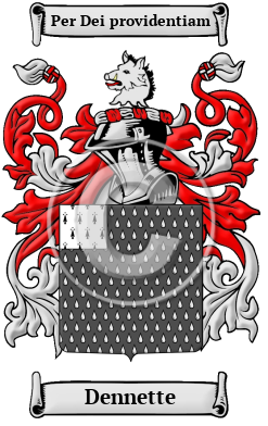 England Etymology of DennetteWhat does the name Dennette mean? When the ancestors of the Dennette family emigrated to England following the Norman Conquest in 1066 they brought their family name with them. They lived in Sussex. The family was originally from D'Anet, in Normandy, 1 which is now home to the Château d'Anet, a château near Dreux, built by Philibert de l'Orme from 1547 to 1552. Early Origins of the Dennette familyThe surname Dennette was first found in Sussex where they held a family seat from very early times. However, the Hundredorum Rolls of 1273 record the first listings of the name: Alicia Denet in Bedfordshire; and Robert Dynot in Oxfordshire. 2 Regardless of this early roll, Sussex has traditionally held the greatest listings of the name through history. Early History of the Dennette familyThis web page shows only a small excerpt of our Dennette research. Another 103 words (7 lines of text) covering the years 1545, 1559, 1566, 1593, 1600, 1601, 1612, 1620, 1645, 1655 and 1666 are included under the topic Early Dennette History in all our PDF Extended History products and printed products wherever possible. Dennette Spelling VariationsThe English language only became standardized in the last few centuries. For that reason, spelling variations are common among many Anglo-Norman names. The shape of the English language was frequently changed with the introduction of elements of Norman French, Latin, and other European languages; even the spelling of literate people's names were subsequently modified. Dennette has been recorded under many different variations, including Dennette, Dennett, Denett, Dennet, Denet and others. Early Notables of the Dennette familyThomas Danett (fl. 1566-1601), English author of the following works:— 1. ‘The Description of the Low Countreys and of the Prouinces thereof, gathered into an Epitome out of the Historie of Lodouico Guicchardini,’ London, 1593, dedicated to Lord Burghley. 2. ‘A Continuation of the Historie of France from the... Another 49 words (4 lines of text) are included under the topic Early Dennette Notables in all our PDF Extended History products and printed products wherever possible. Migration of the Dennette familyTo escape the uncertainty of the political and religious uncertainty found in England, many English families boarded ships at great expense to sail for the colonies held by Britain. The passages were expensive, though, and the boats were unsafe, overcrowded, and ridden with disease. Those who were hardy and lucky enough to make the passage intact were rewarded with land, opportunity, and social environment less prone to religious and political persecution. Many of these families went on to be important contributors to the young nations of Canada and the United States where they settled. Dennettes were some of the first of the immigrants to arrive in North America: John Dennett who settled in Maine in 1630; Samuel Dennett and his wife Susannah arrived in west New Jersey in 1664; Alexander Dennett arrived in Maine in 1630.