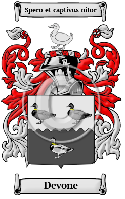 | Devone History, Family Crest & Coats of Arms Etymology of DevoneWhat does the name Devone mean? The Anglo-Saxon name Devone comes from the family having resided near a body of water derived from the Old English word that means deep waters. Early Origins of the Devone familyThe surname Devone was first found in Sussex where they held a family seat from very ancient times, some say well before the Norman Conquest and the arrival of Duke William at Hastings in 1066 A.D. Early History of the Devone familyThis web page shows only a small excerpt of our Devone research. Another 70 words (5 lines of text) are included under the topic Early Devone History in all our PDF Extended History products and printed products wherever possible. Devone Spelling VariationsDevone has been spelled many different ways. Before English spelling became standardized over the last few hundred years, spelling variations in names were a common occurrence. As the English language changed in the Middle Ages, absorbing pieces of Latin and French, as well as other languages, the spelling of people's names also changed considerably, even over a single lifetime. Spelling variants included: Devenish, Devonish, Devanay, Devenay, Deveney, Devenney, Devenny, O'Devanny, O'Devenish, O'Devonish and many more. Early Notables of the Devone familyMore information is included under the topic Early Devone Notables in all our PDF Extended History products and printed products wherever possible. Migration of the Devone family to IrelandSome of the Devone family moved to Ireland, but this topic is not covered in this excerpt. Another 54 words (4 lines of text) about their life in Ireland is included in all our PDF Extended History products and printed products wherever possible. Migration of the Devone familyIn an attempt to escape the chaos experienced in England, many English families boarded overcrowded and diseased ships sailing for the shores of North America and other British colonies. Those families hardy enough, and lucky enough, to make the passage intact were rewarded with land and a social environment less prone to religious and political persecution. Many of these families became important contributors to the young colonies in which they settled. Early immigration and passenger lists have documented some of the first Devones to arrive on North American shores: John Devenish who settled in Barbados in 1680 with his wife, two children, and servants; another John settled in New England in 1678; Hugh, Daniel, John, Michael, Samuel, Thomas, and William Devenney, all arrived in Philadelphia between 1840 and 1870..