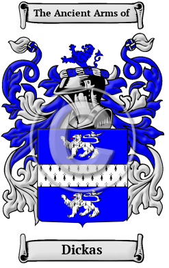 | Dickas History, Family Crest & Coats of Arms Etymology of DickasWhat does the name Dickas mean? The name Dickas is of Anglo-Saxon origin and came from the personal name Richard. Dicca (in the modern form, Dick) is a diminutive of the name Richard. When the son suffix is added to the root, the name literally means son of Richard. 1 "Richard was commonly called Dick, and his sons, were styled 'Dickson' and 'Dickieson.' " 2 Early Origins of the Dickas familyThe surname Dickas was first found in Lancashire at Wrightington, a township, in the parish of Eccleston, union of Wigan, hundred of Leyland. "Robert Dicconson, of Eccleston, married Anne, daughter of John Wrightington, and was grandfather of William, who was convicted of high treason in the reign of William III. The Dicconsons held the property until 1812, when Capt. Edward Dicconson died without issue, and was succeeded by a nephew, Thomas Eccleston, of Eccleston and Scarisbrick. His son Charles, on succeeding to this estate, assumed the name of Dicconson." 3 Welsh Whitte, again in Lancashire was another estate of the same family. It was originally known as Walsewythull and Walshwittell. "In 1707 it was forfeited by the treason of William Dickenson, then owner, but, owing to legal technicality, the manor was not seized by the crown; and the Dicconsons, his descendants, have since been the principal proprietors." 3 Early History of the Dickas familyThis web page shows only a small excerpt of our Dickas research. Another 181 words (13 lines of text) covering the years 1300, 1366, 1388, 1594, 1624, 1659, 1663, 1670, 1696, 1700, 1707, 1712, 1713, 1717, 1719, 1722, 1741, 1752 and 1869 are included under the topic Early Dickas History in all our PDF Extended History products and printed products wherever possible. Dickas Spelling VariationsBefore English spelling was standardized a few hundred years ago, spelling variations of names were a common occurrence. Elements of Latin, French and other languages became incorporated into English through the Middle Ages, and name spellings changed even among the literate. The variations of the surname Dickas include Dickieson, Dickinson, Dickeson, Dickenson and others. Early Notables of the Dickas familyJohn Dickenson (fl. 1594), English romance-writer of unknown origin. 4